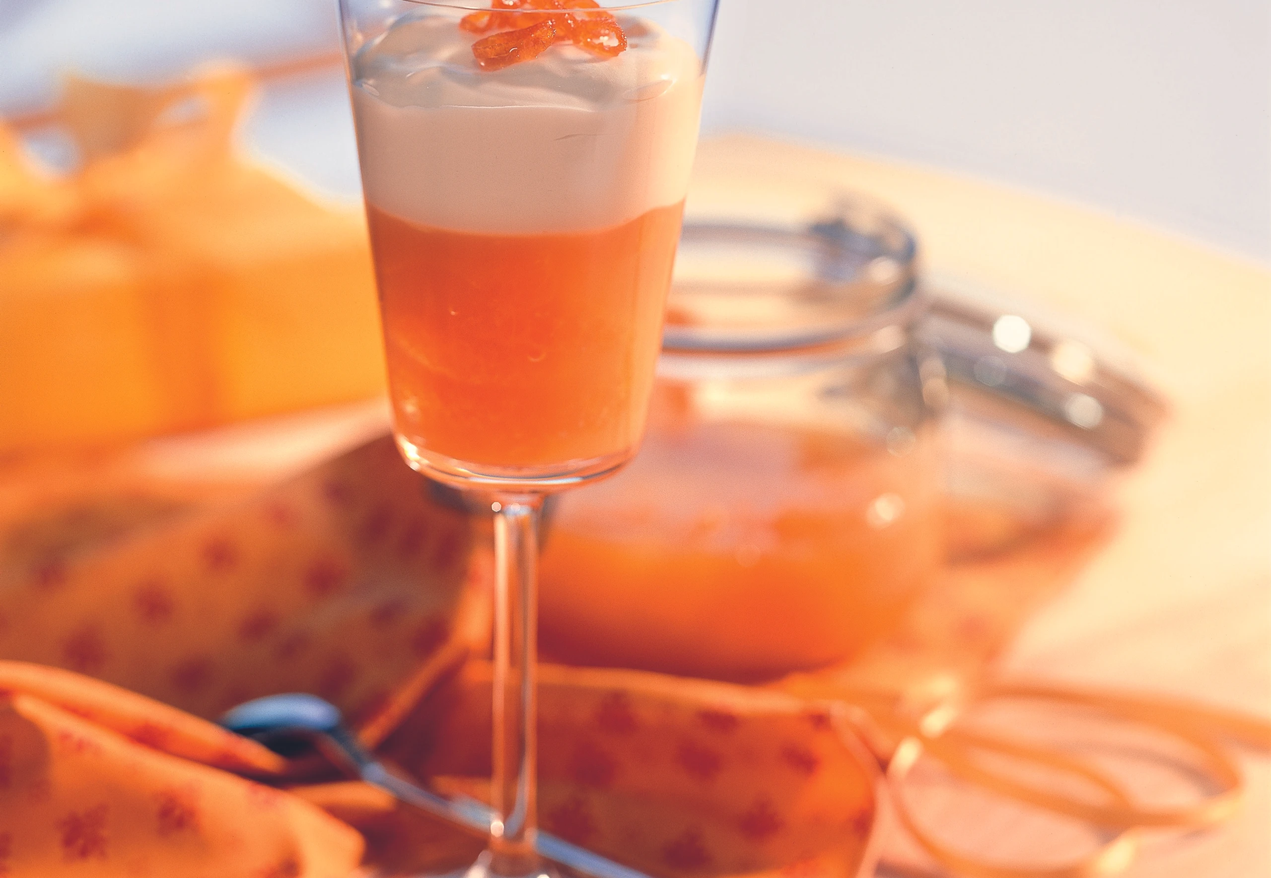 Likör und Joghurt in den Saft rühren, Obers schlagen und unterheben. Orangencreme auf das Gelee in die Gläser füllen – weitere 4 Stunden kühlen.