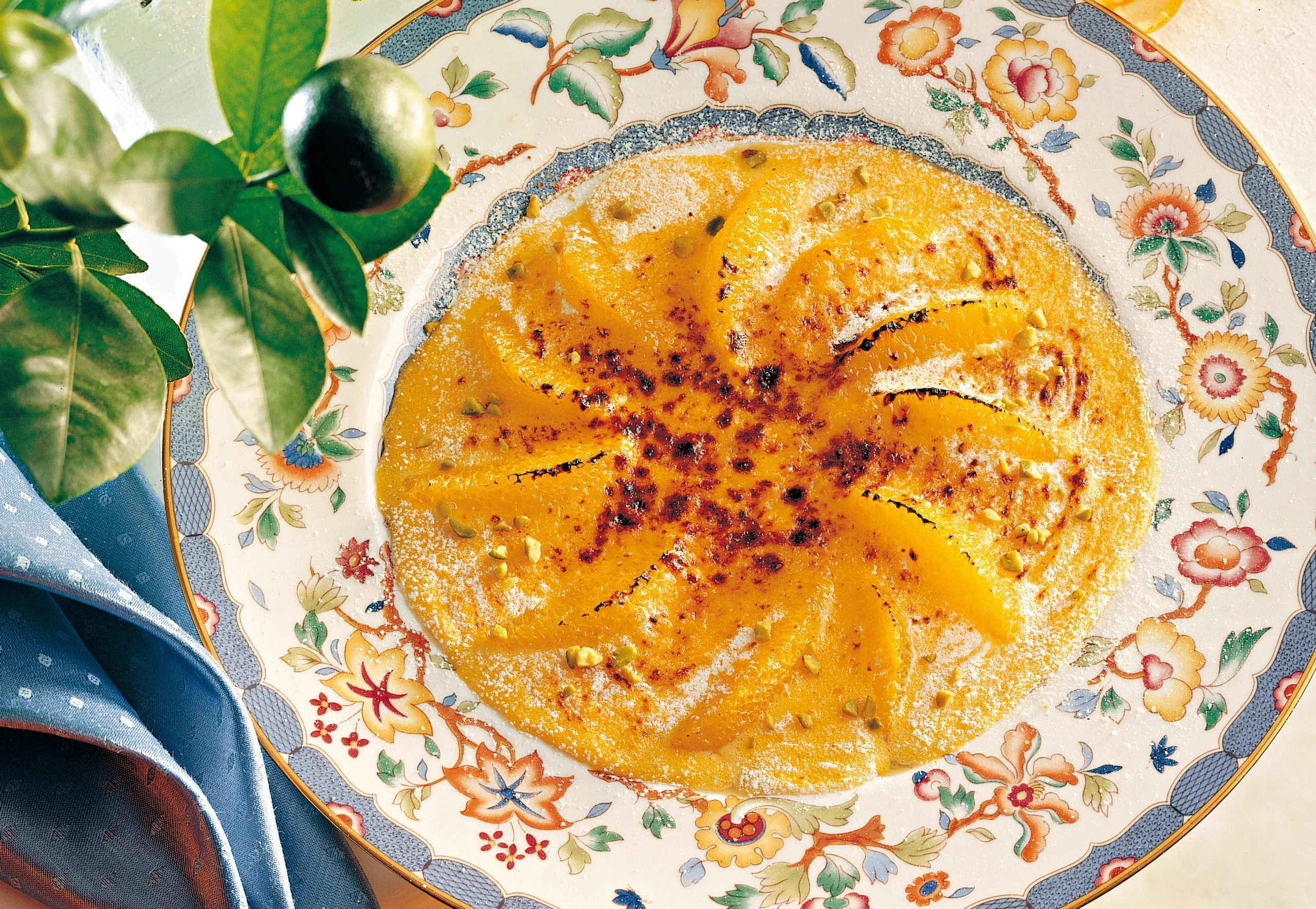 Orangenfilets mit der Creme gleichmäßig überziehen, mit Staubzucker bestreuen und im vorgeheizten Rohr (oberste Schiene / Gitterrost) goldgelb überbacken. Vor dem Servieren mit den Pistazien bestreuen.