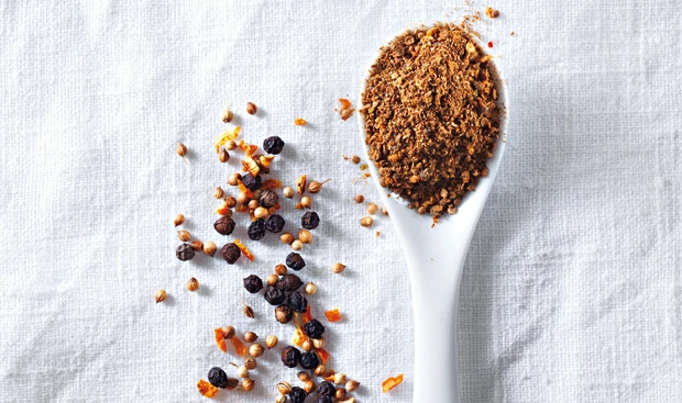 Koriander, Pfeffer und Piment in einer trockenen Pfanne rösten, bis die Gewürze duften. Auskühlen lassen und mahlen, mit Zucker, Orangenschale und restlichen Gewürzen mischen.