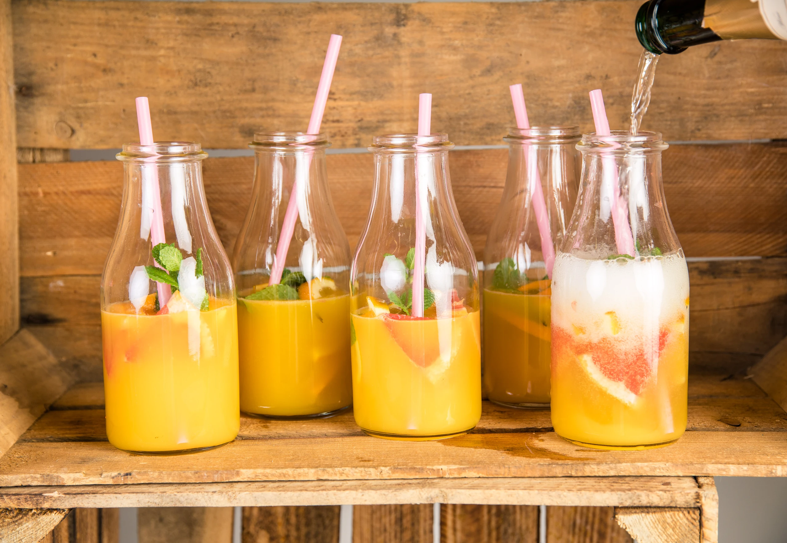 - Orangen-, Mango- und Zitronensaft verrühren und in die Gläser leeren. Mit Sekt aufgießen.