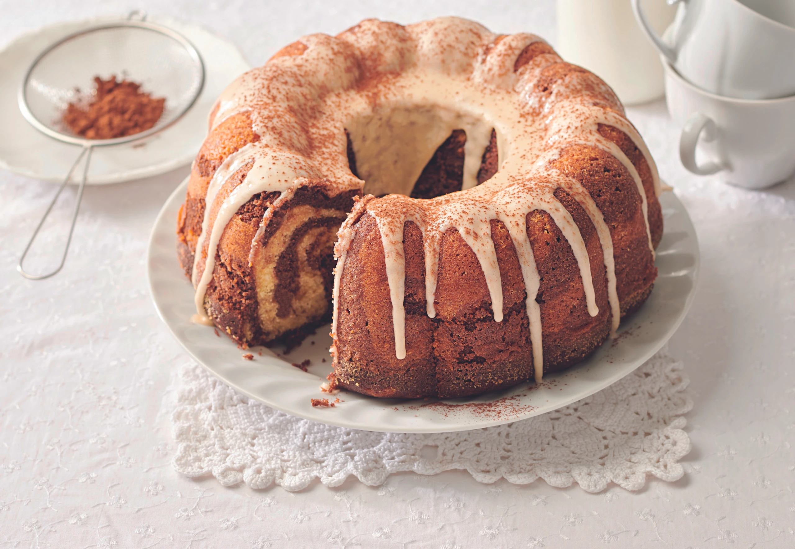 Gugelhupf aus dem Rohr nehmen und ca. 20 Minuten überkühlen lassen. Aus der Form stürzen und auskühlen lassen.