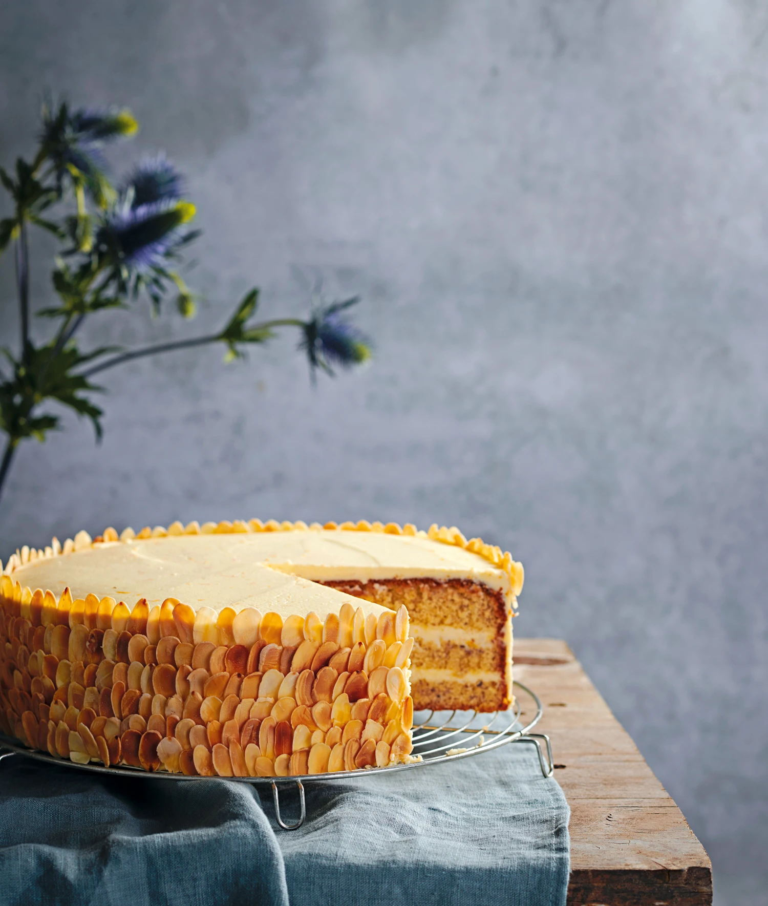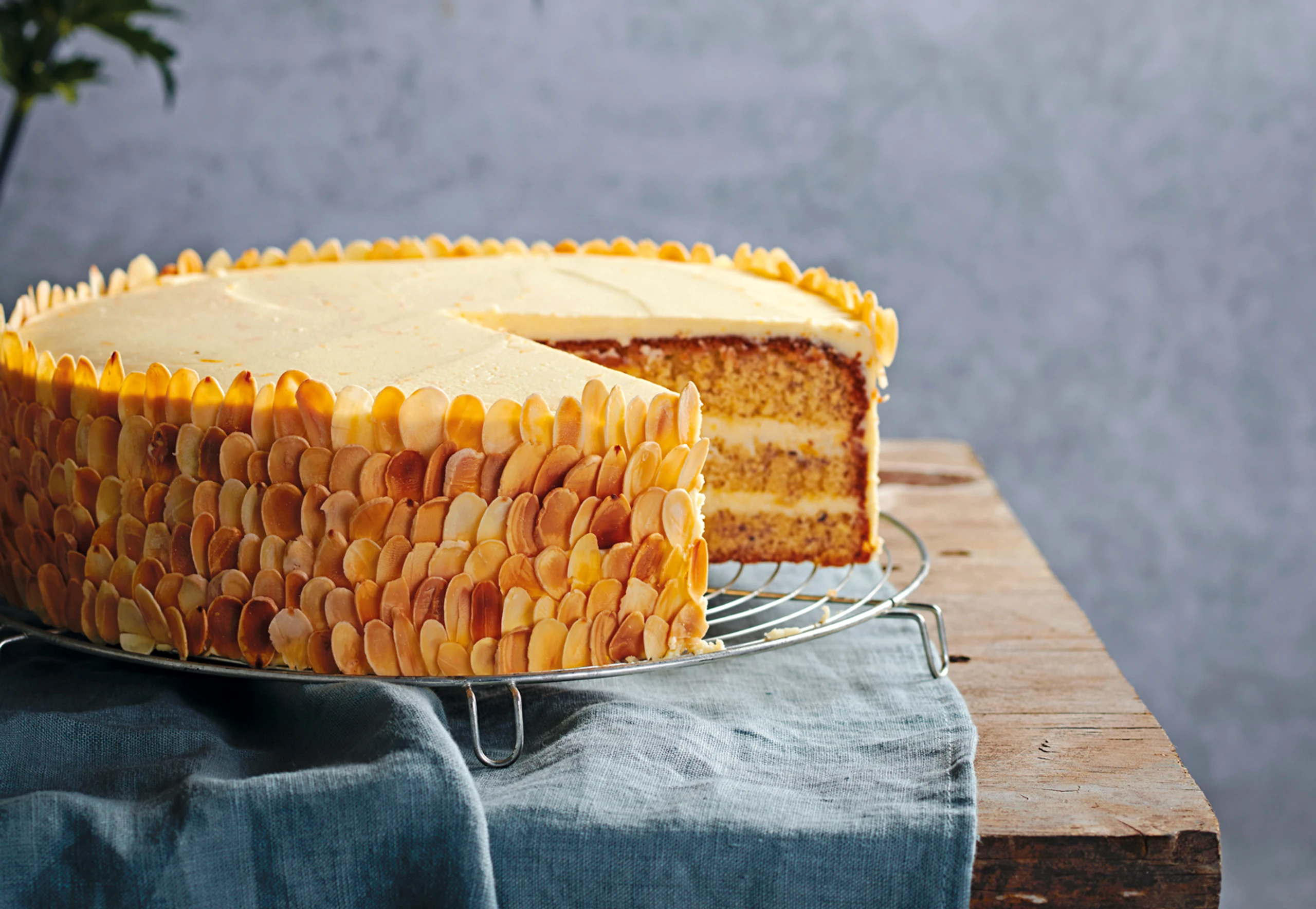 Für die Creme Butter und Zucker ca. 3 Minuten cremig mixen. Frischkäse, Ricotta, Orangensaft und -schale untermixen. Tortenboden mit einem Drittel der Creme bestreichen. Zweiten Boden darauf legen und vorsichtig andrücken. Ein Drittel der Creme darauf verstreichen. Übrigen Boden darauf legen und vorsichtig andrücken. Torte mit der übrigen Creme rundum einstreichen und für ca. 3 Stunden kalt stellen.