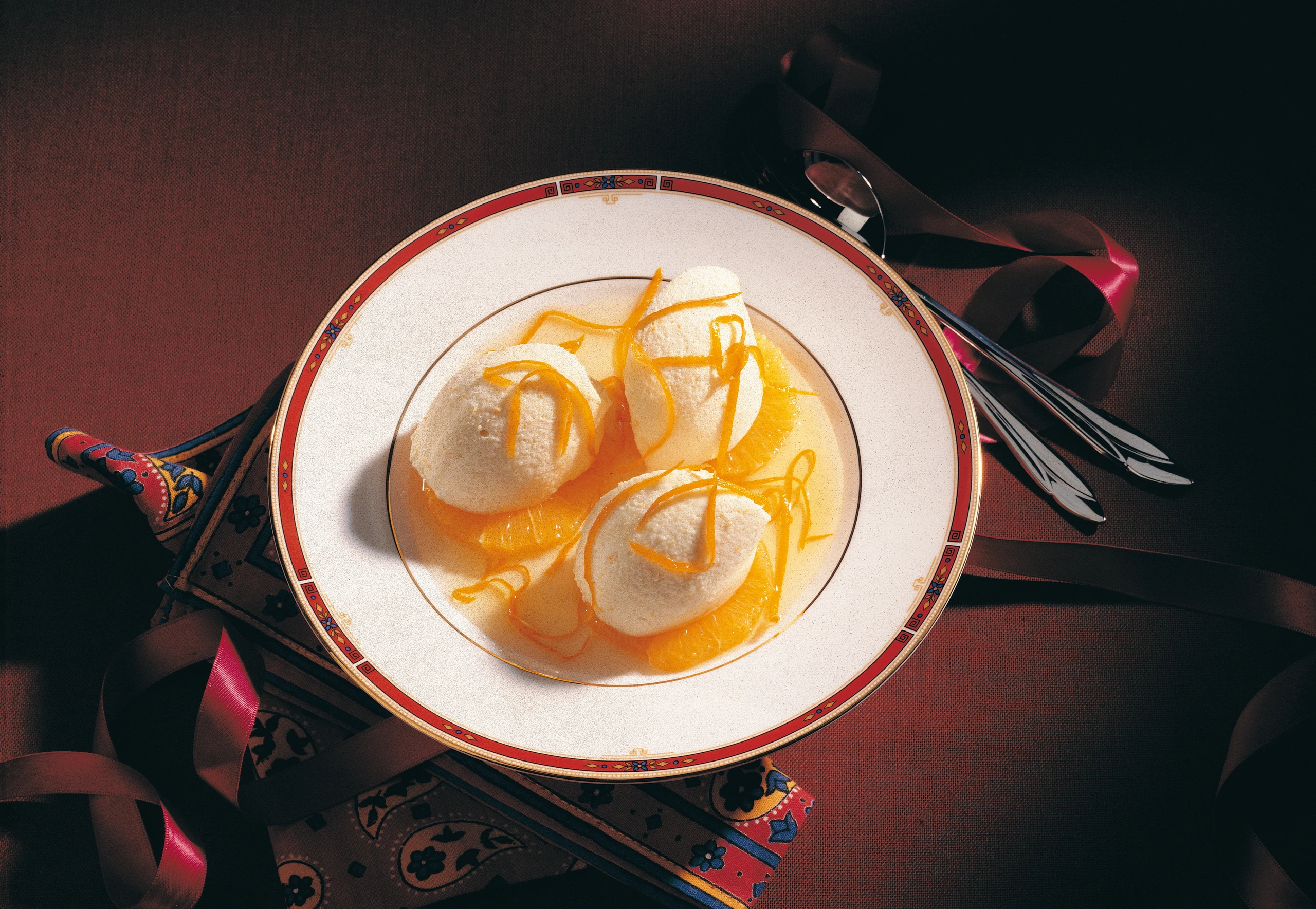 Schale der Orangen in dünnen Streifen abheben (Zestenreißer), in Salzwasser kurz kochen, abschrecken und gut abtropfen lassen. Wasser mit Kristallzucker aufkochen, Zesten darin 2 Minuten kochen. Topf vom Feuer nehmen, Zesten im Kochfond auskühlen lassen. Zesten aus dem Fond heben, gut abtropfen lassen und die Orangennockerl damit garnieren.