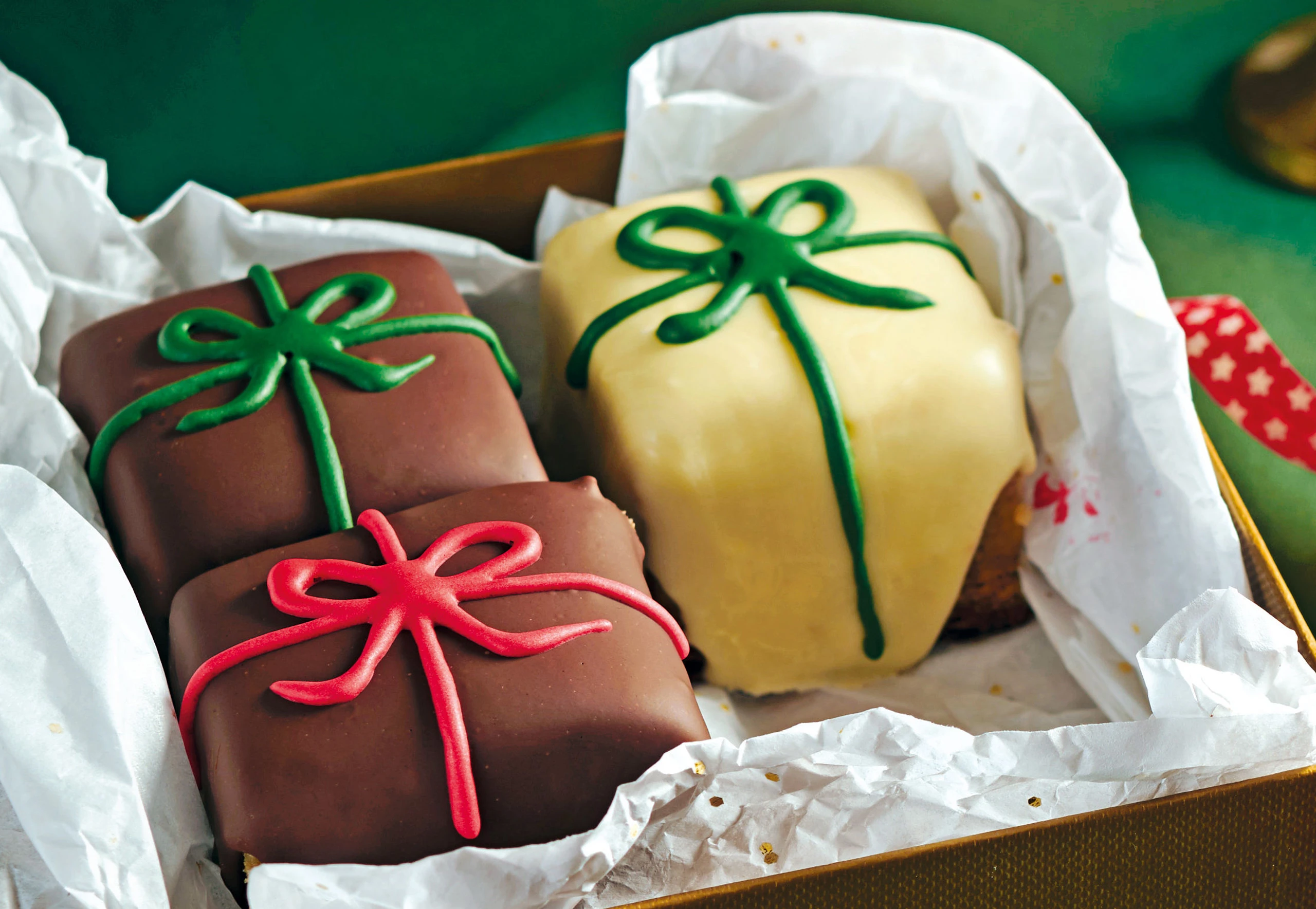 Eiklar und Staubzucker cremig mixen. Halbieren, einen Teil rot, den anderen grün einfärben. In Stanitzel füllen und die Petit fours damit verzieren. Glasur trocknen lassen.