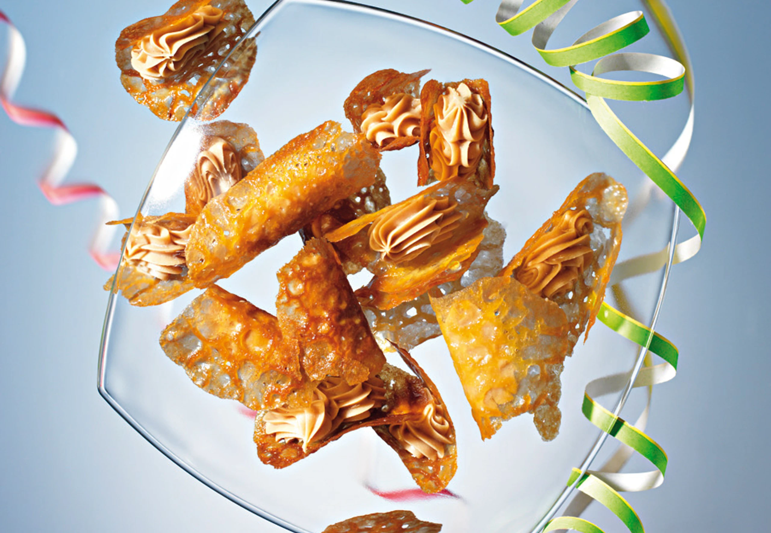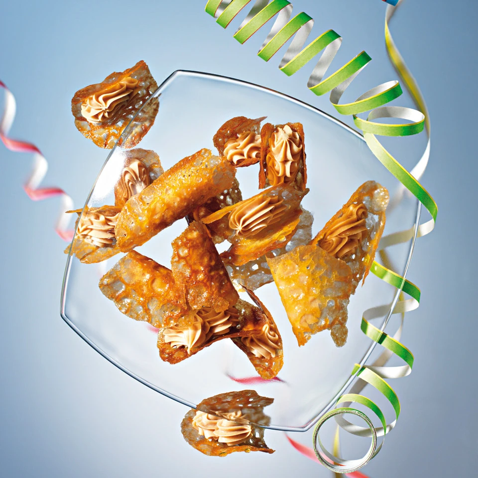 - Scheiben aus dem Rohr nehmen, überkühlen lassen, zu Bögen formen und auskühlen lassen. Creme in einen Dressiersack mit Sterntülle geben. Orangenbögen mit der Creme füllen.