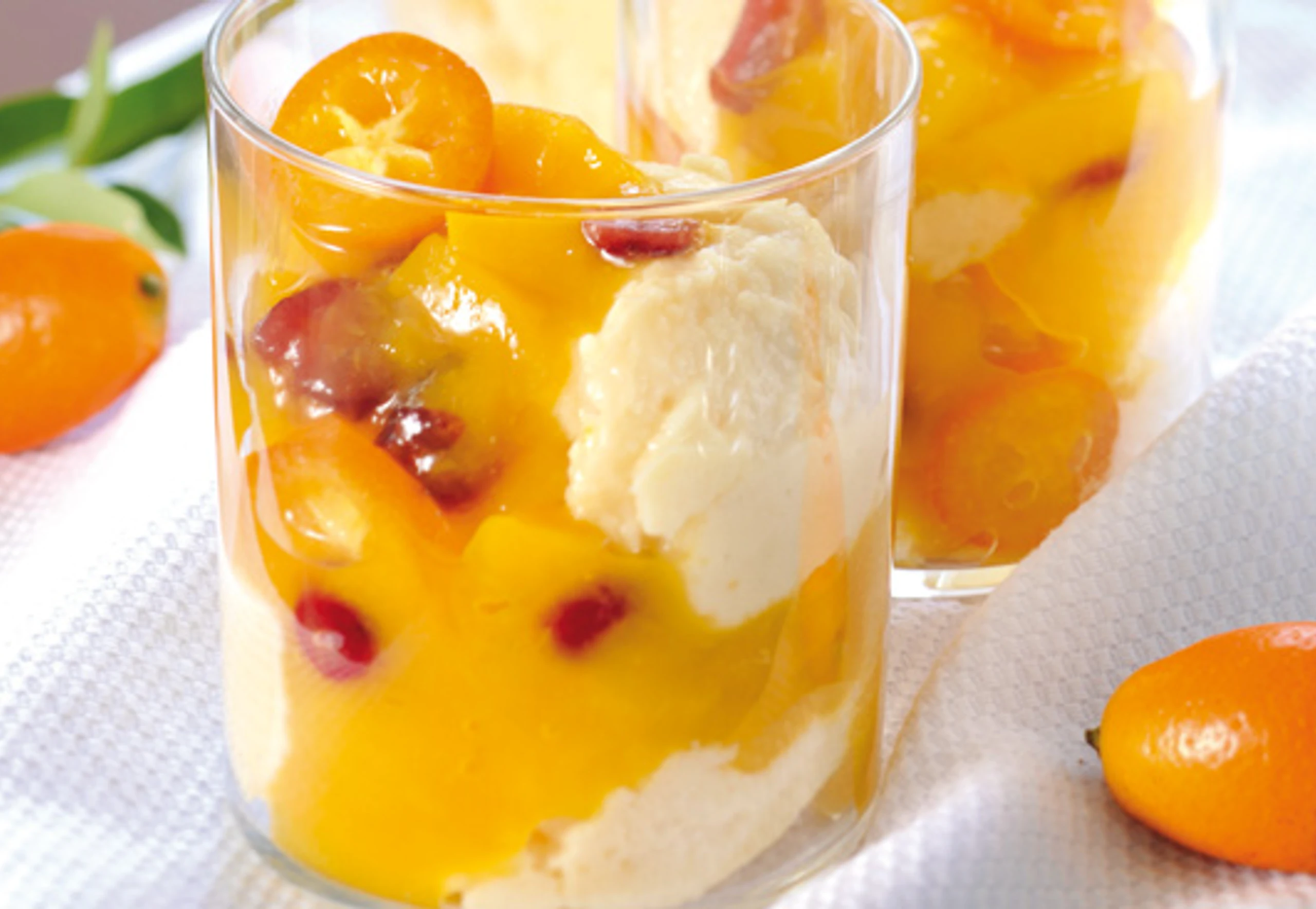 Orangen-Mousse mit dem Löffel portionieren und mit dem Mango-Kompott in Gläsern anrichten.