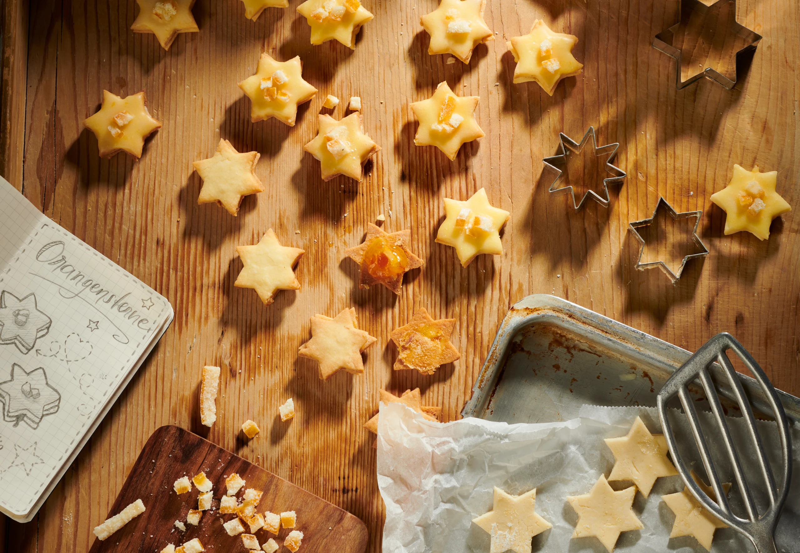 Sterne auf ein Gitter legen und mit der Glasur beträufeln. Aranzini klein schneiden und darüber streuen. Kekse trocknen lassen und in einer Dose aufbewahren.