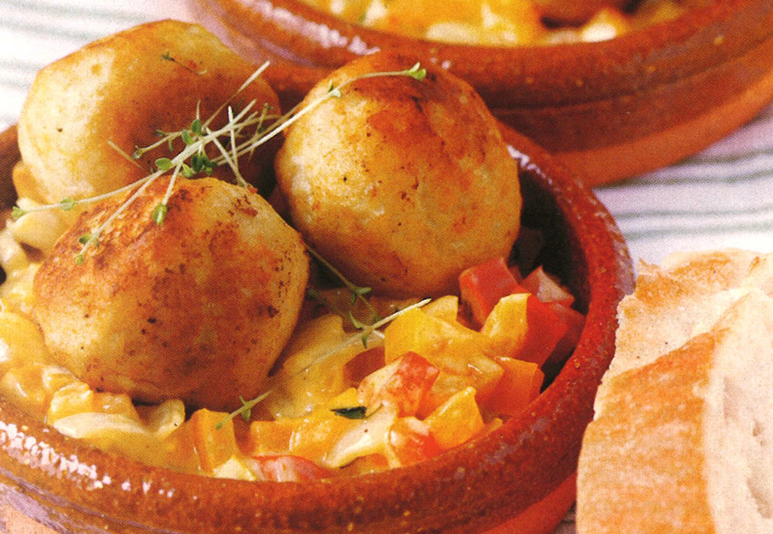 Aus der Fleischmasse Bällchen (Durchmesser etwa 5 cm) formen und im Öl rundum goldbraun braten. Mit dem Gemüse anrichten, mit Thymian garnieren. Dazu passt Fladenbrot.