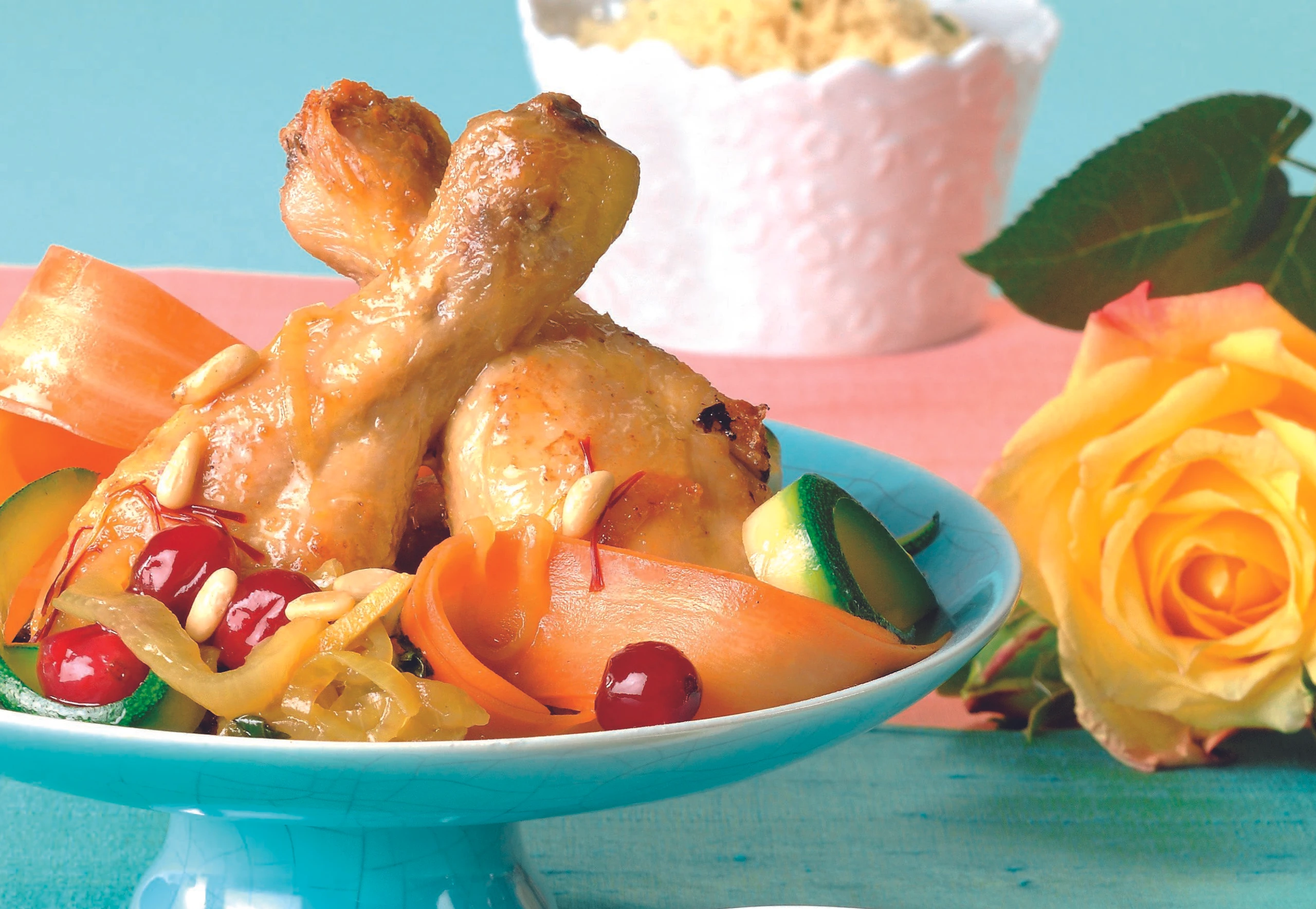 - Orientalisches Hühnchen mit Karotten und Zucchini anrichten, mit Pinienkernen bestreuen. Couscous dazu reichen.