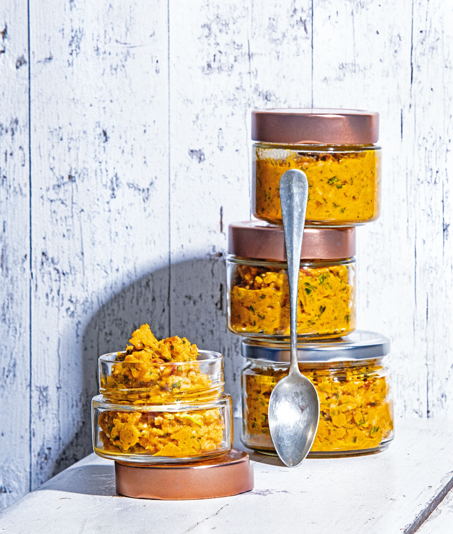 Datteln, Tahin und Öl unterrühren. Mischung in einem Kutter pürieren und umfüllen. Pecorino, Pistazien, Petersilie und Oregano unterrühren. Pesto mit Salz, Pfeffer, Kreuzkümmel und Ras el-Hanout würzen, in Gläser füllen, verschließen und kühl stellen.
