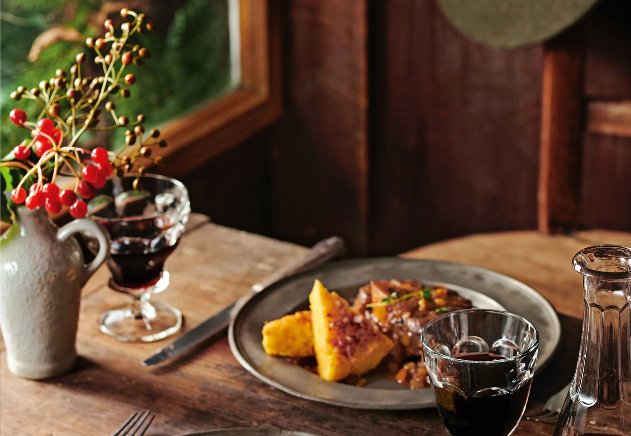 Polenta aus dem Rohr nehmen, mit zerkleinertem Speck bestreuen und portionieren. Fleisch mit der Sauce anrichten, mit Thymianzweigen garnieren und mit den Polentaschnitten servieren.