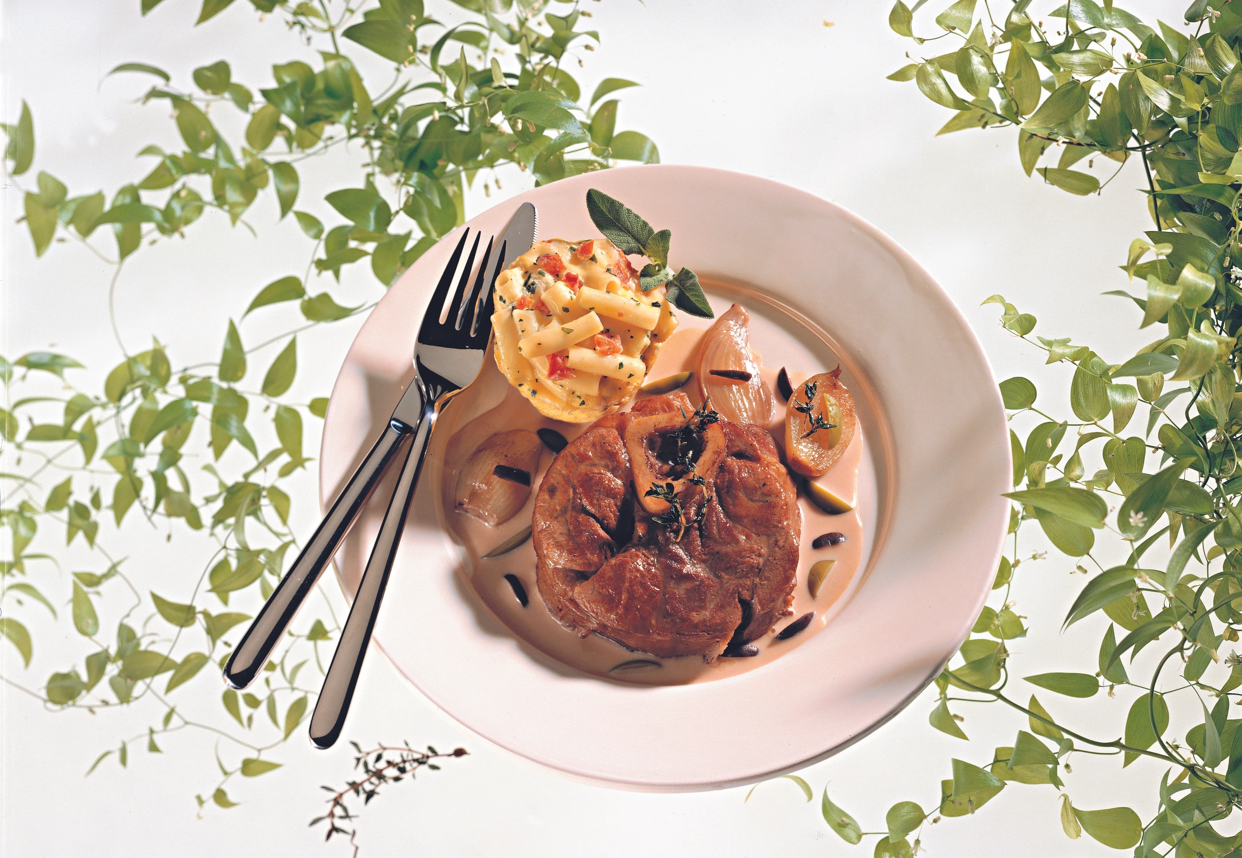 Ossobuco mit Schafkäsesauce und Makkaroni-Törtchen