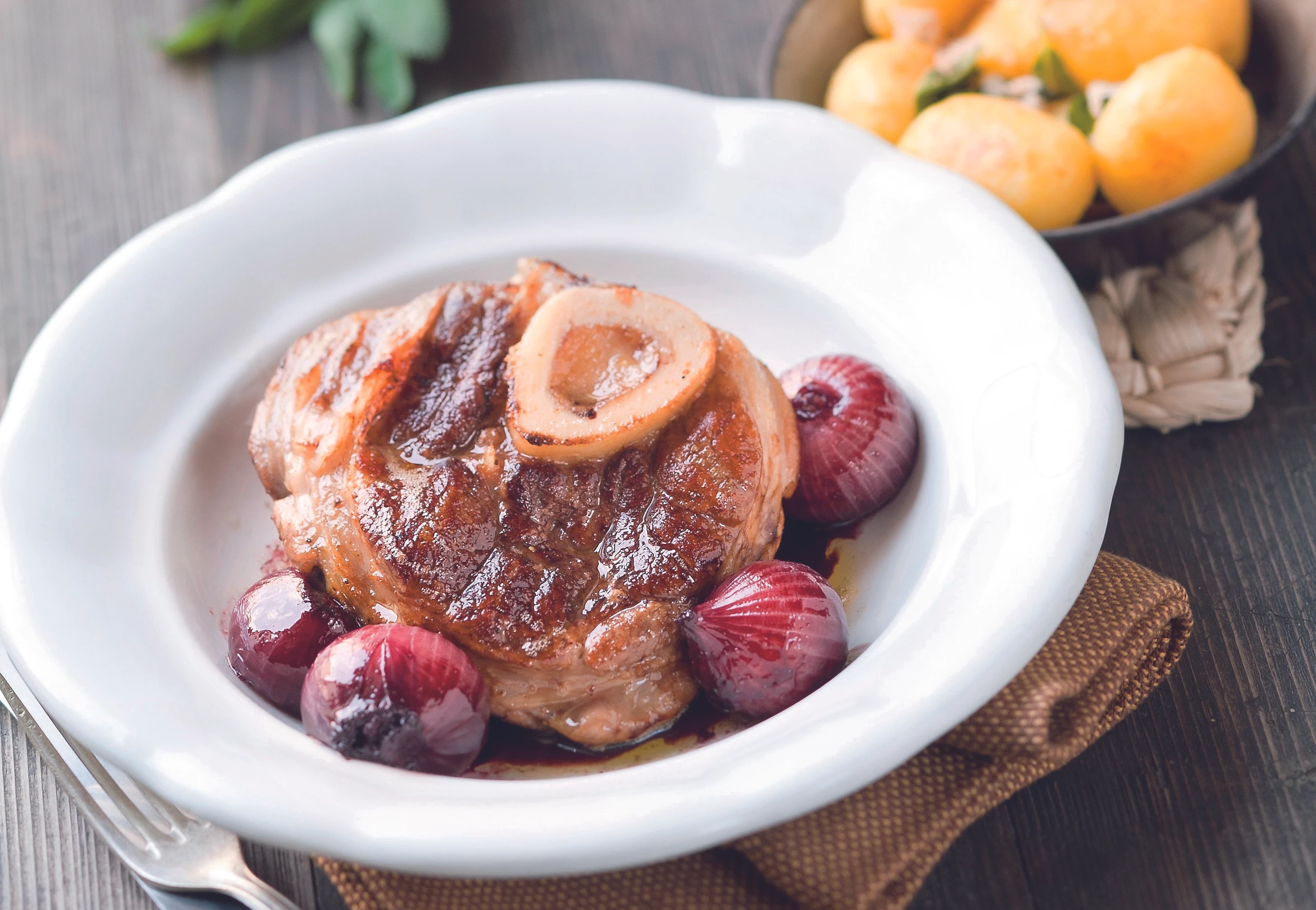 Ossobuco mit Rotweinschalotten und Salbeierdäpfeln