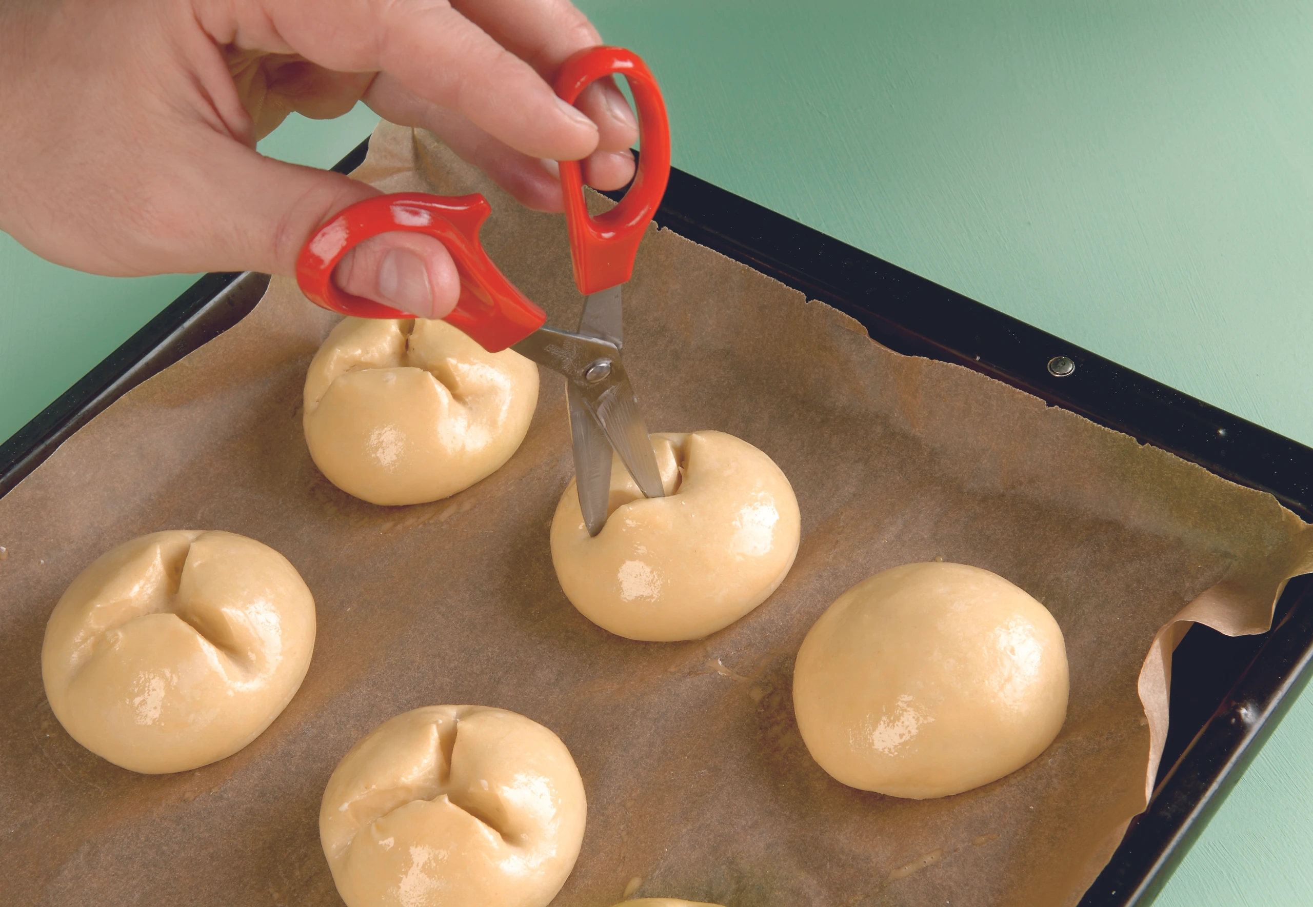 Teigkugeln auf ein mit Backpapier belegtes Backblech legen und an einem warmen Ort zugedeckt 30 Minuten rasten lassen.
