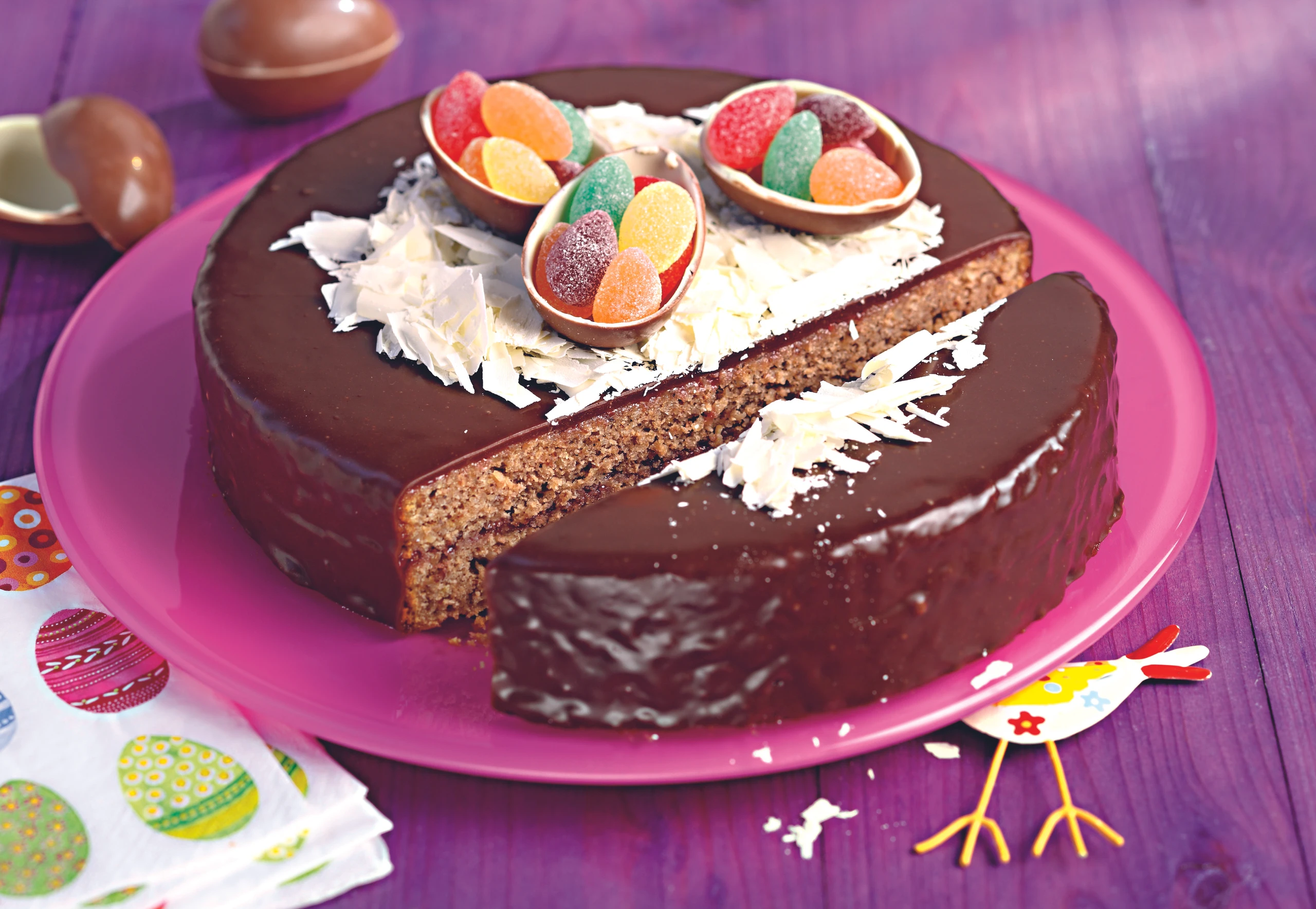Für die Glasur Kuvertüre und Nougat grob hacken und zusammen in einem ca. 50°C warmen Wasserbad schmelzen. Obers aufkochen und in die Nougatmischung rühren. Mischung für ca. 10 Minuten kühl stellen. Glasur gleichmäßig auf der Torte verteilen. Torte für ca. 1 Stunde kühl stellen. Torte mit Kuvertüre, Überraschungs- und Dragee-Eiern garnieren.