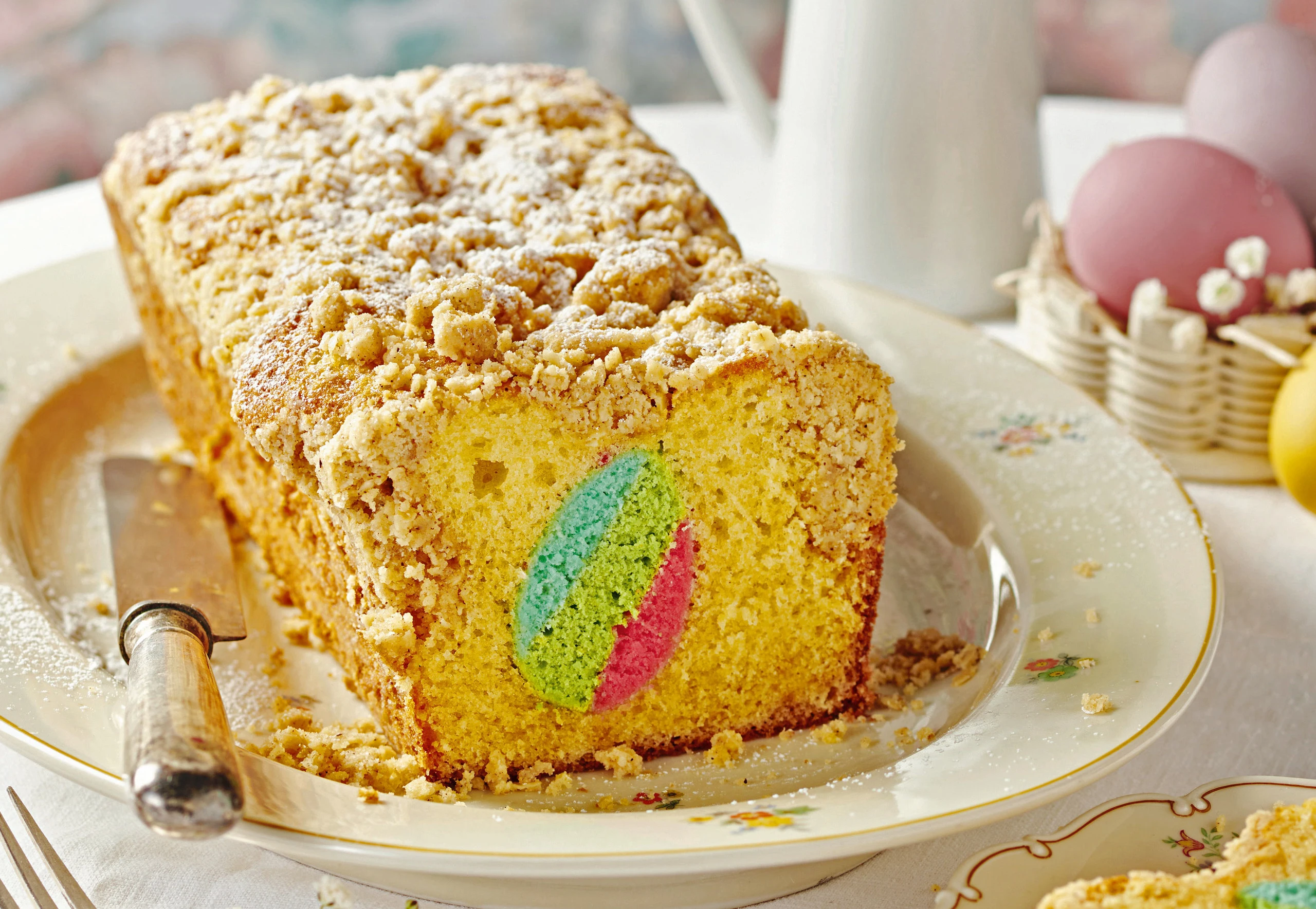 Masse in einen Dressiersack füllen. Eine dünne Schicht auf den Boden der Kastenform dressieren. Ostereier aneinander anschließend in die Form schichten. Mit der Kuchenmasse umhüllen. Streusel darauf verteilen. Im Rohr (zweite Schiene von unten, Gitterrost) ca. 1 Stunde backen. Herausnehmen und 10 Minuten überkühlen lassen. Aus der Form stürzen und auskühlen lassen. Kuchen mit Staubzucker bestreut servieren.