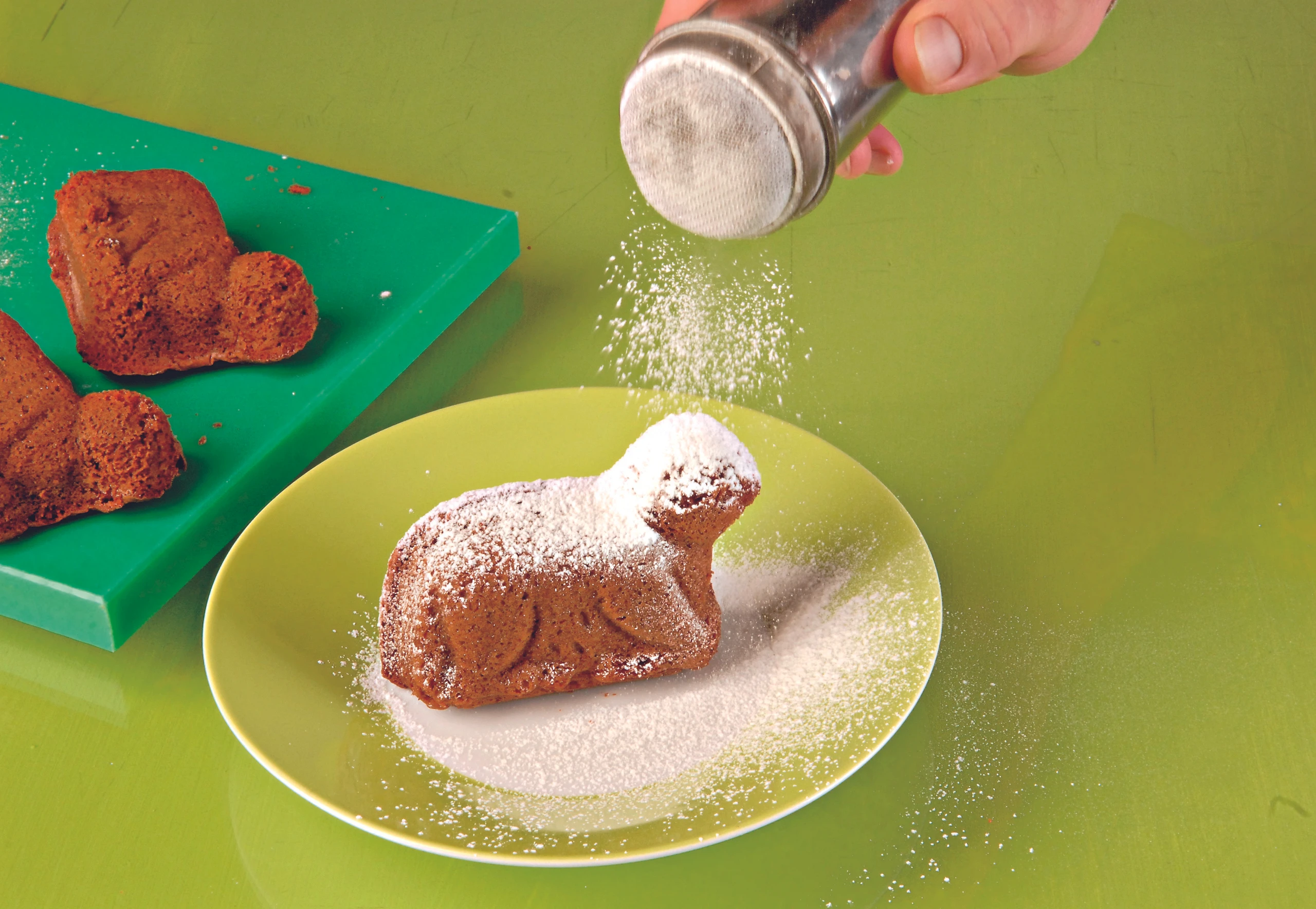 Lämmer aus dem Rohr nehmen, ca. 1 Minute in den Formen rasten lassen, dann herausstürzen. Lämmer auskühlen lassen und mit Staubzucker bestreuen.