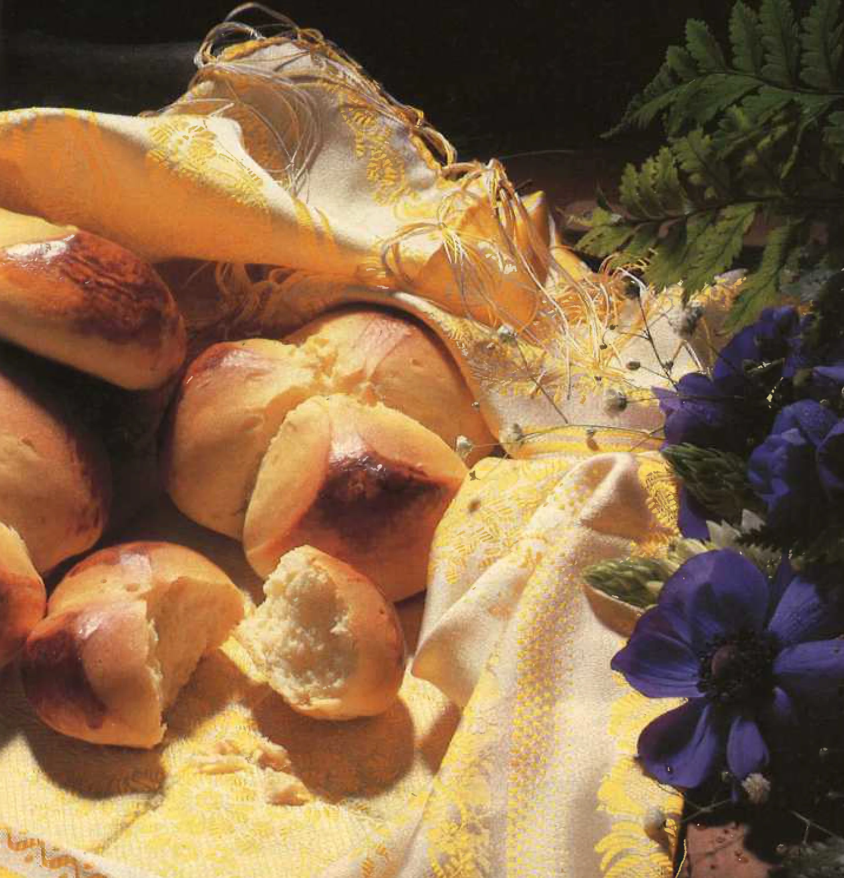 Mit einer befeuchteten Schere jede Kugel dreimal einschneiden. Mit Dotter bestreichen (Innenseiten der Schnittflächen nicht bestreichen). Weitere 20 Minuten lang gehen lassen.