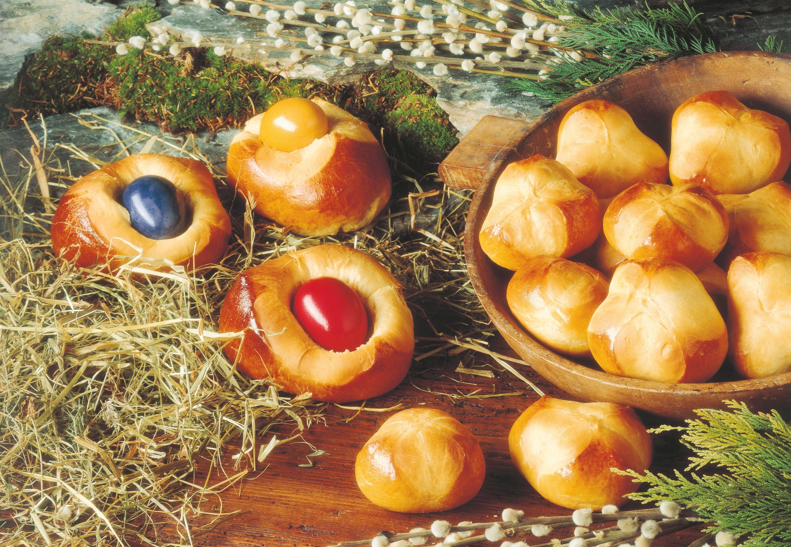 Backrohr auf 180 °C vorheizen. Pinzen nochmals mit Ei bestreichen, jede Kugel mit einer Schere dreimal einschneiden (sternförmig).
