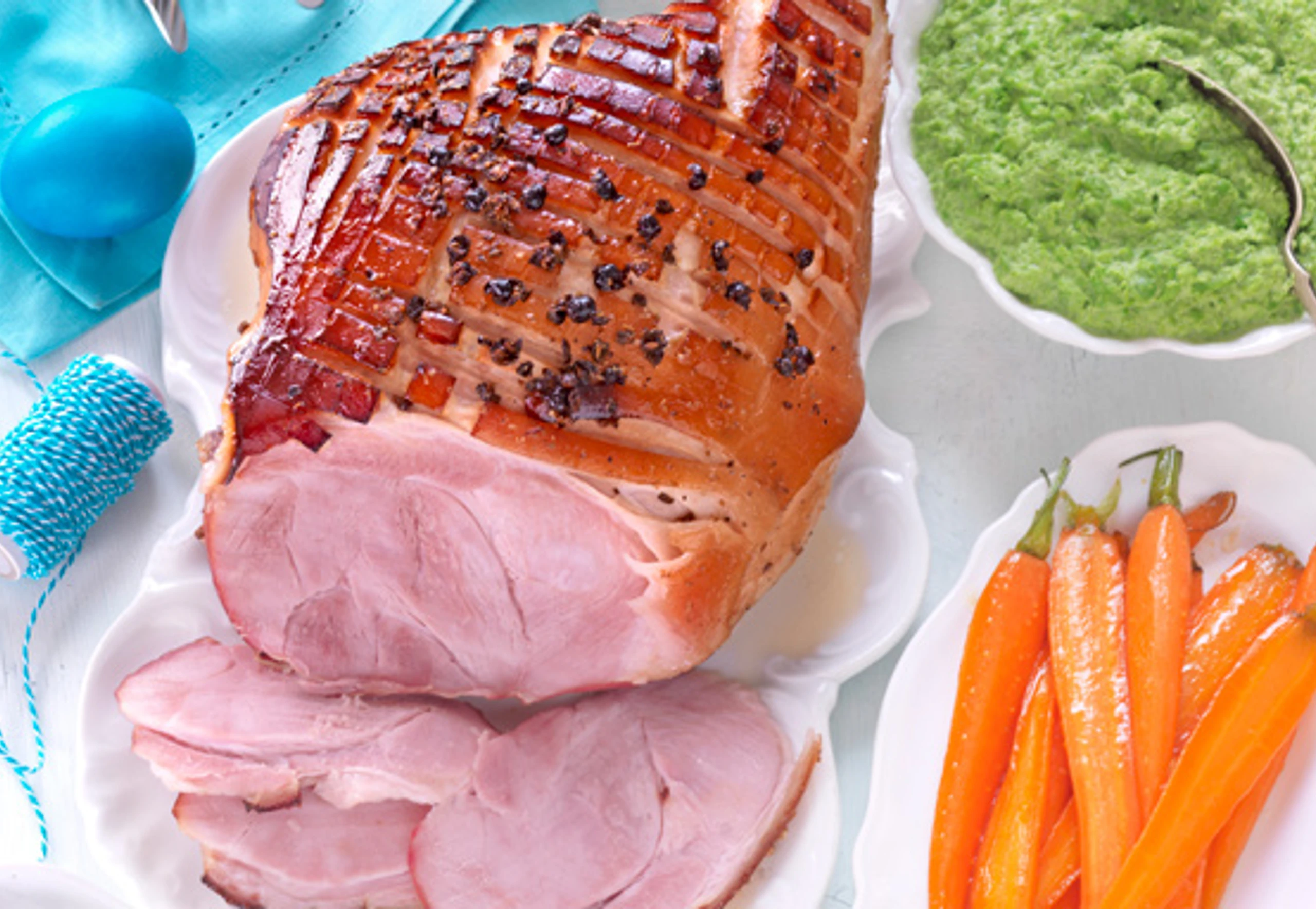 Osterschinken mit Erbsenmus und glasierten Karotten