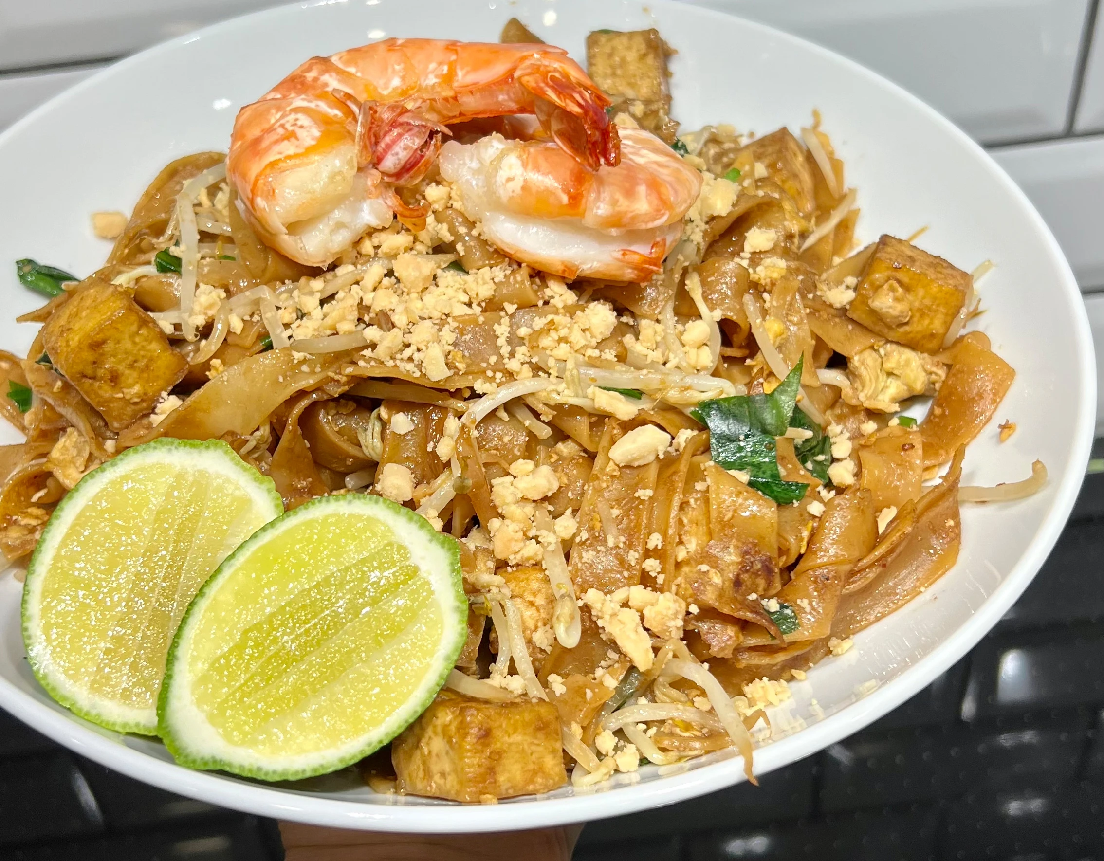 Pad Thai mit Garnelen, Erdnüssen und Limetten servieren.