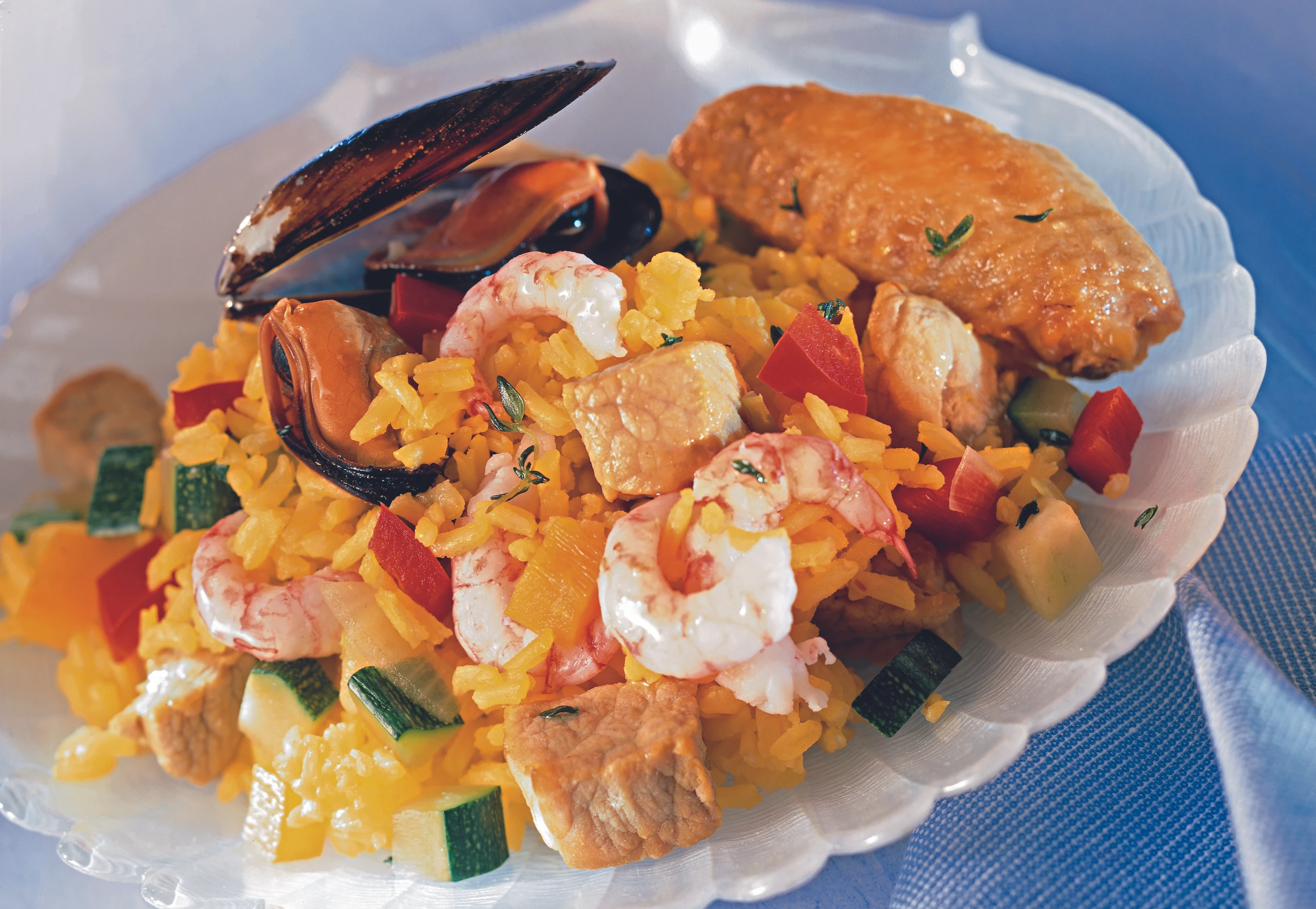 Reis mit einer Gabel aufrühren und das Lorbeerblatt entfernen. Fleisch und Hühnerflügerln aus der Kochflüssigkeit heben. Fleisch, Hühnerflügerln, Muscheln und Shrimps unter den Reis mischen. Paella rasch servieren.