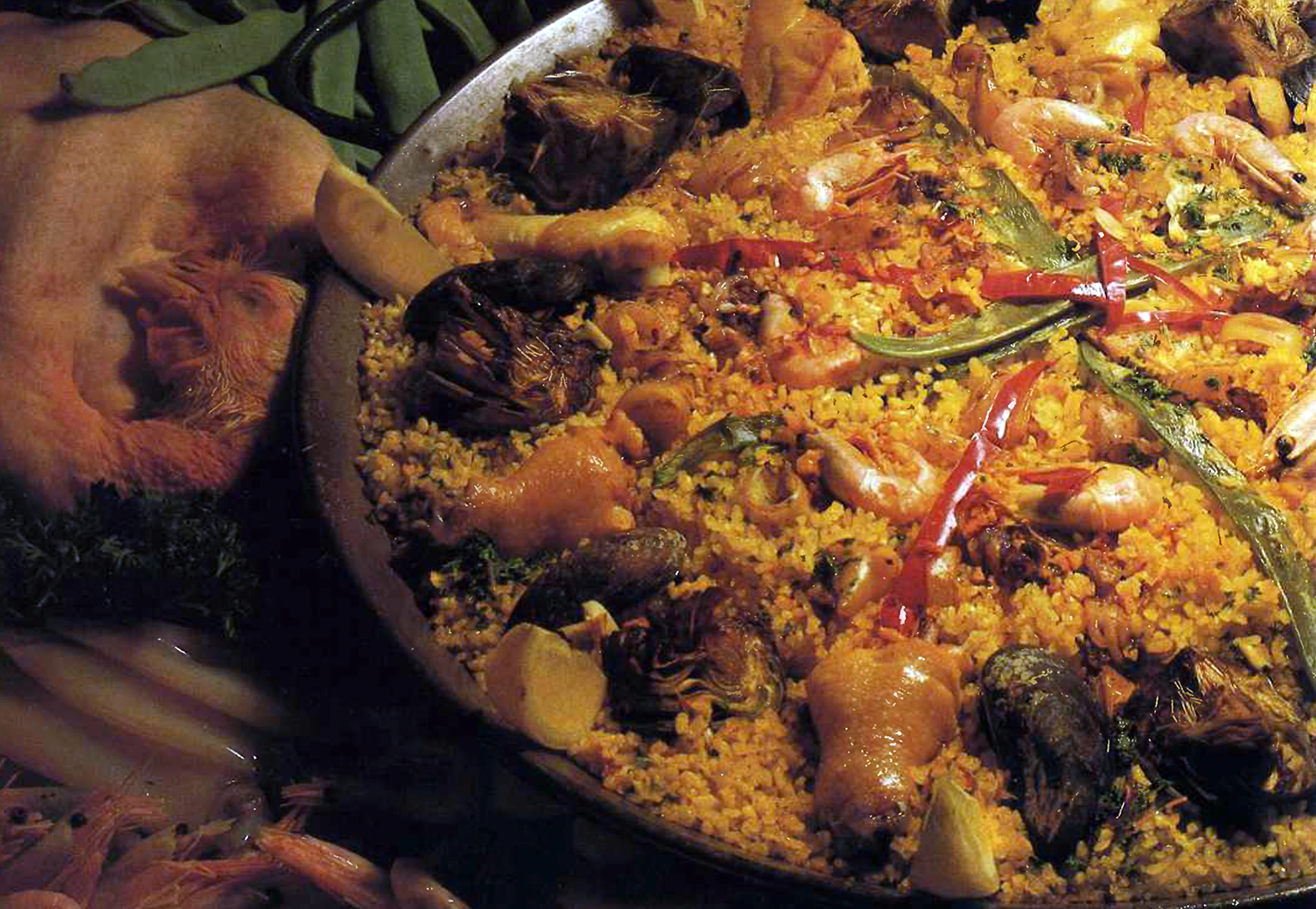 Reis im Olivenöl gut anbraten und die Gewürzmischung dazugeben. Hühnerteile, Tintenfische, Artischocken, Fisolen, Paprika und Garnelen auf dem Reis verteilen, Muscheln in den Reis stecken. Mit Muschelsaft und Kochwasser aufgießen, so dass der Reis gerade bedeckt ist. Langsam und gleichmäßig garen, immer wieder Flüssigkeit nachgießen, sobald der Reis trocken wird.