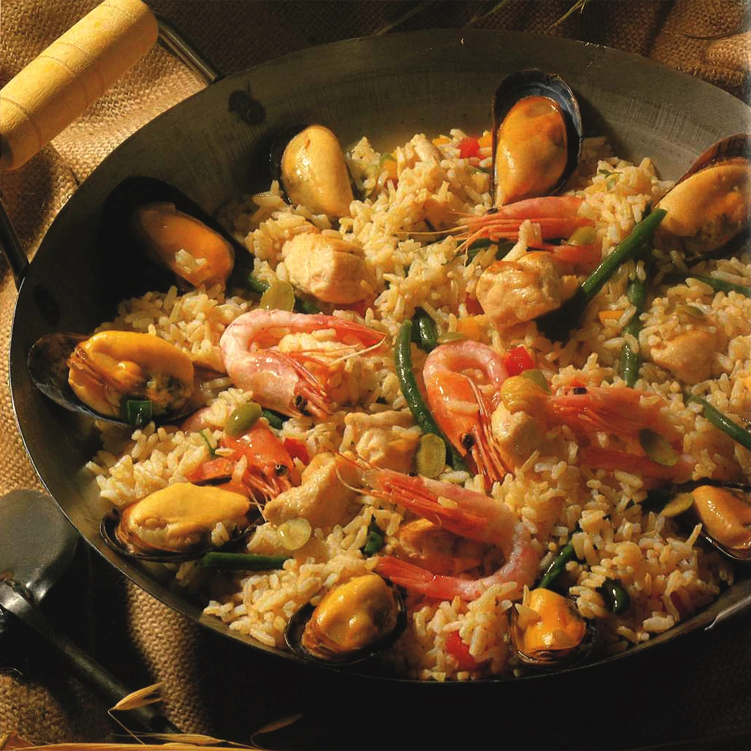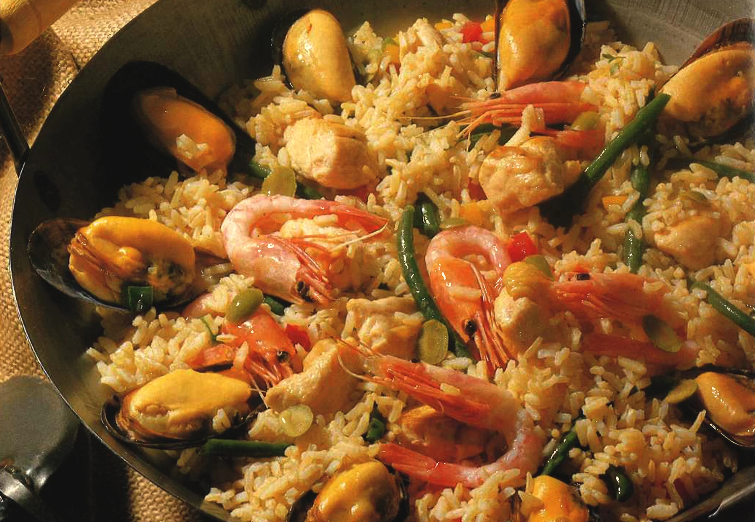 In einem großflächigen Kochgeschirr Olivenöl erhitzen und das Schweinerne, Hühnerfleisch, Muscheln und Shrimps oder Steingarnelen kurz anbraten. Schalotten zufügen und mit Hühnersuppe aufgießen. Salzen und pfeffern. Naturreis zufügen, durchrühren und zugedeckt ca. 30 Minuten lang dünsten. Währenddessen öfter umrühren.