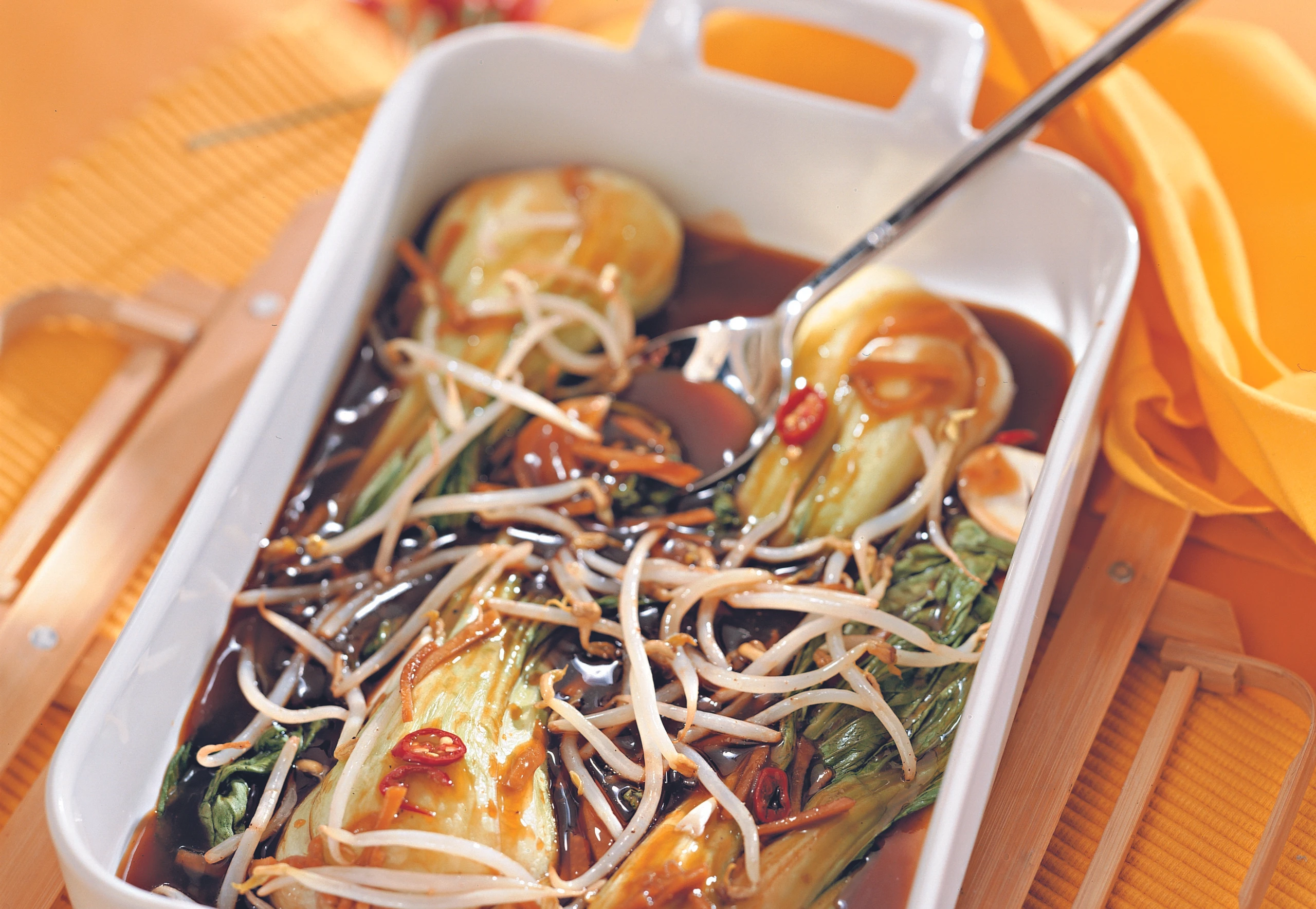 In einem flachen Topf Geflügelfond mit Austernsauce, dunkler und heller Sojasauce, Zwiebel, Knoblauch und Ingwer aufkochen. Pak Choi einlegen und zugedeckt ca. 10 Minuten bissfest dünsten, dabei mehrmals wenden. Zuletzt Sojasprossen zugeben und ca. 2 Minuten mitdünsten.