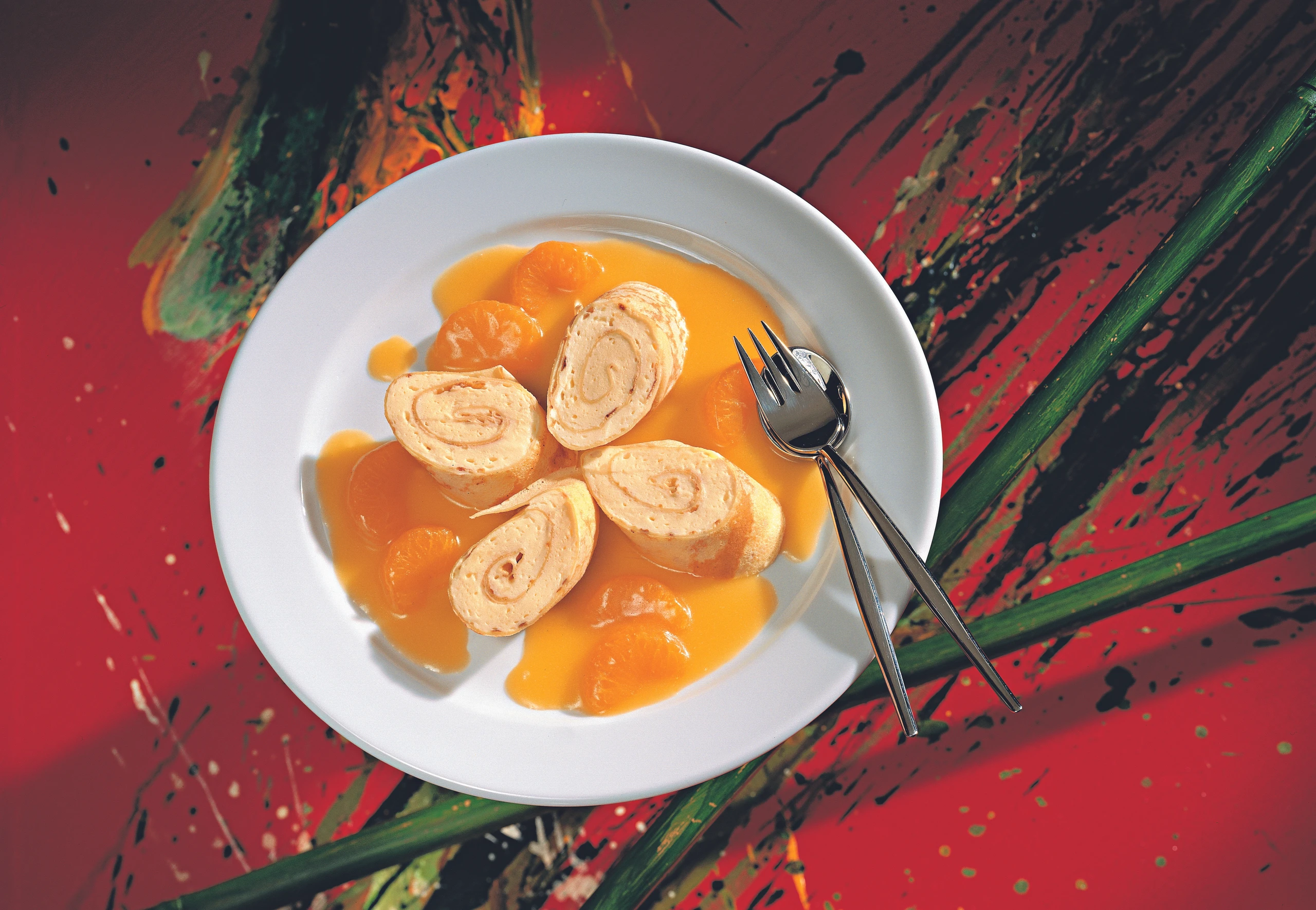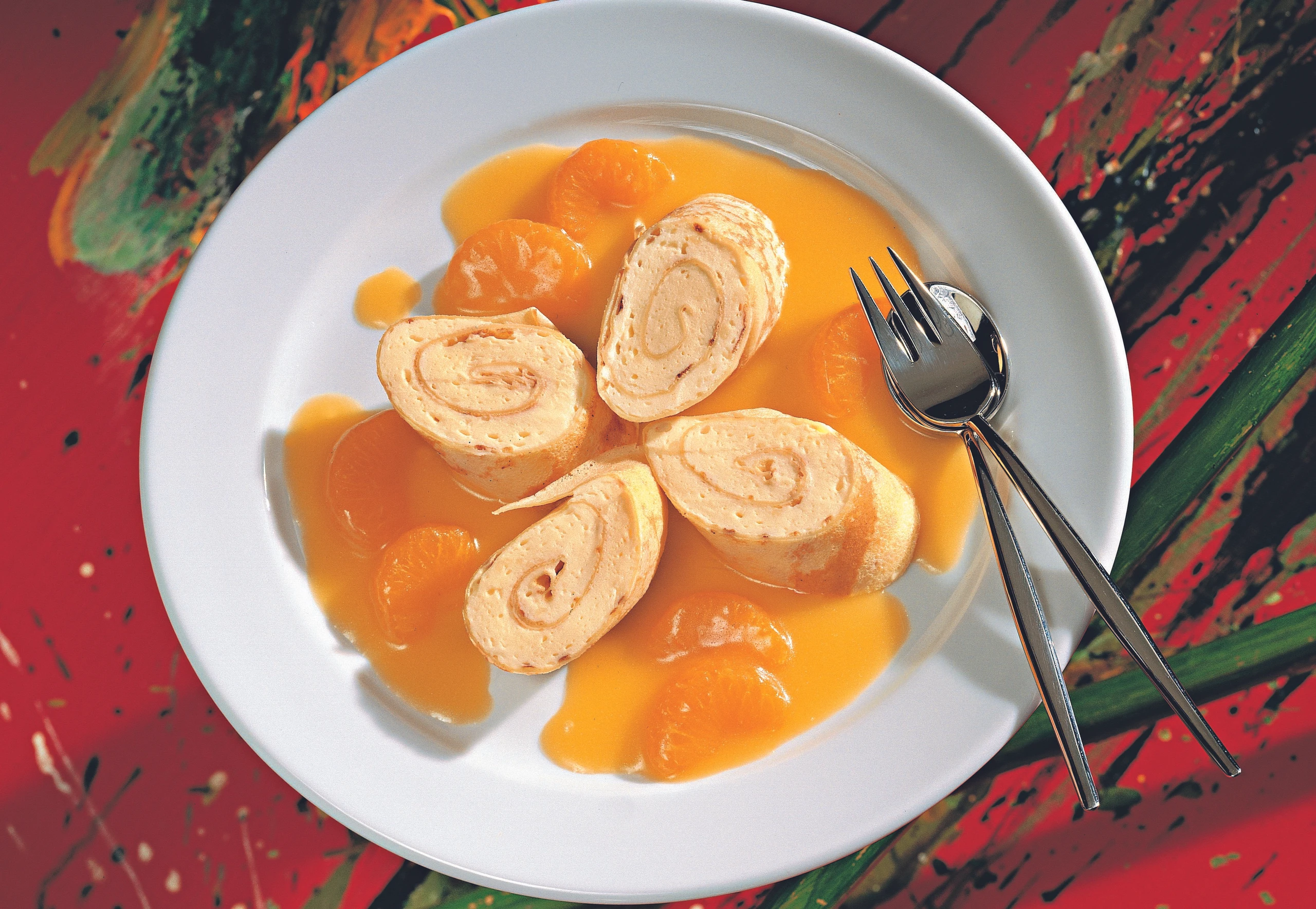 Palatschinken-Rouladen mit Vanillefülle und Orangen-Mandarinensauce