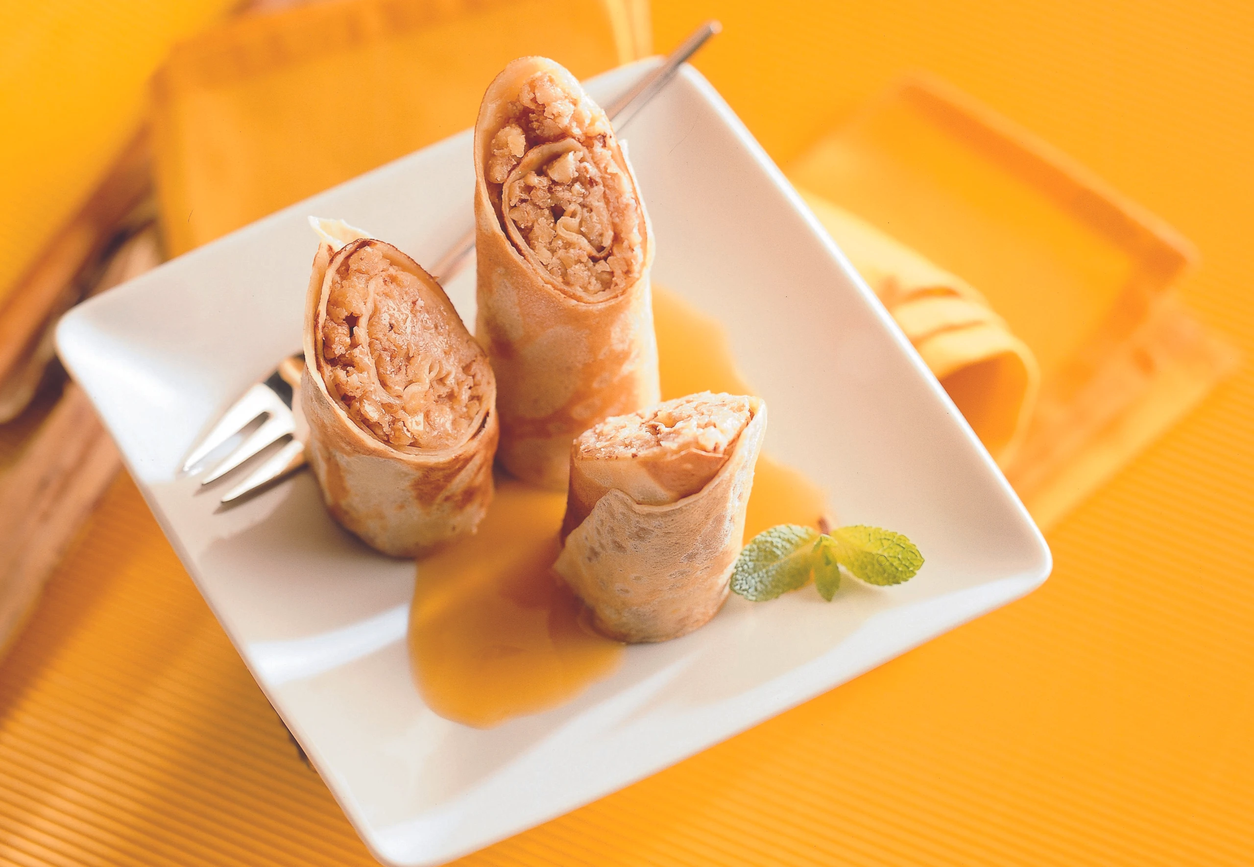Palatschinken-Nussröllchen mit Orangensauce