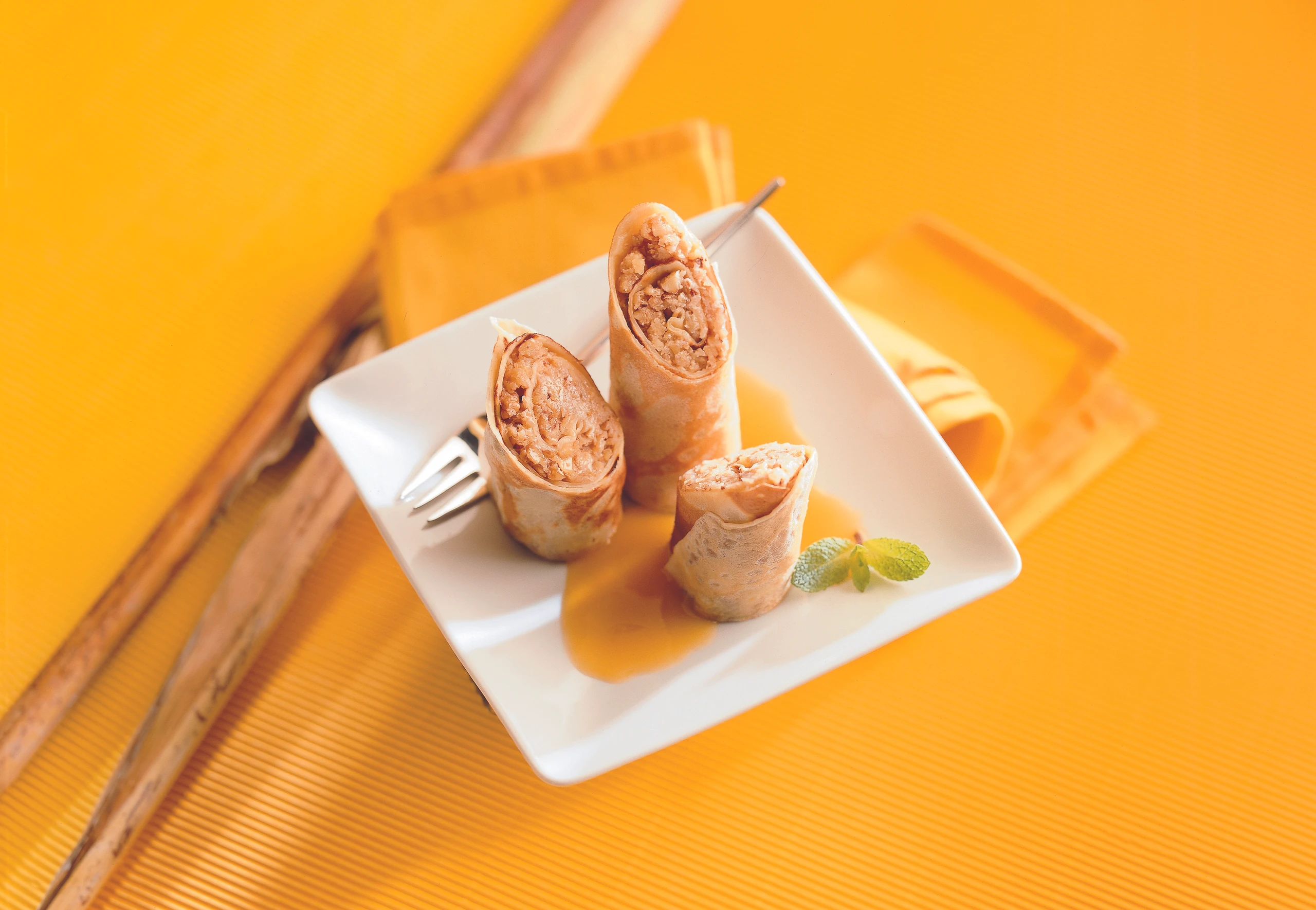 Palatschinken mit Fülle bestreichen, eng einrollen und mit Alufolie zudecken.