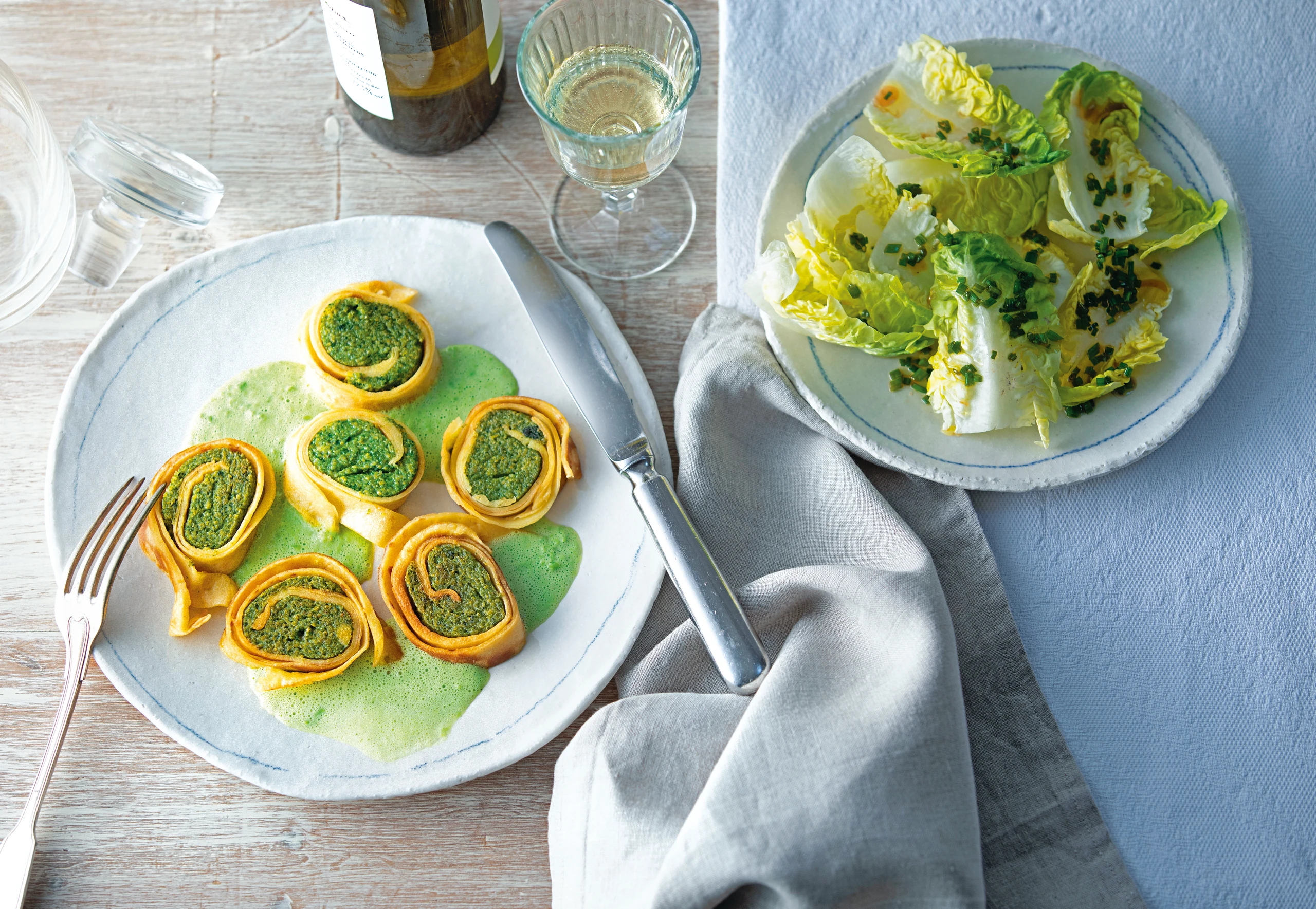 Palatschinken-Roulade mit Spinatpolenta und Erbsensauce