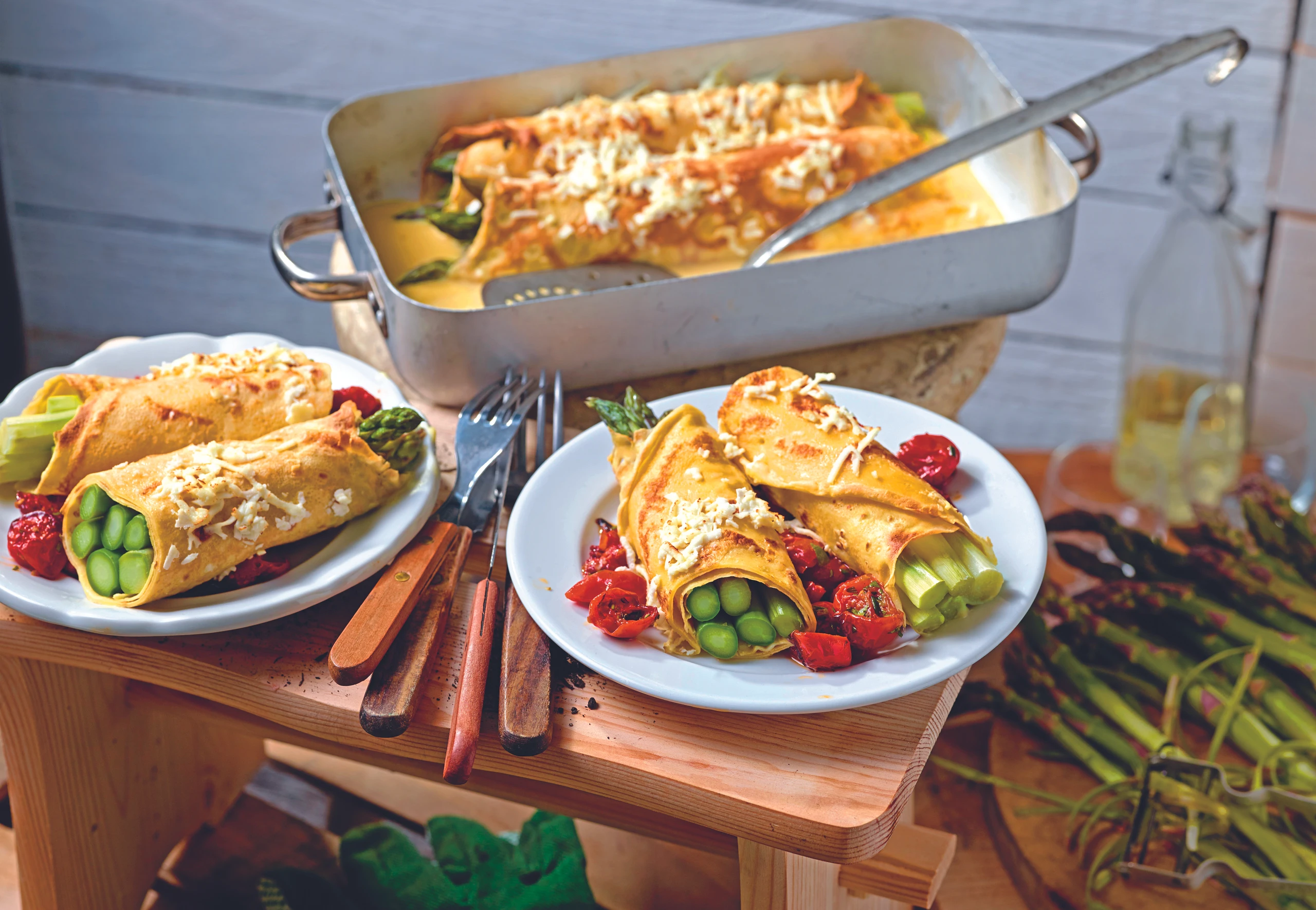 Palatschinken mit grünem Spargel, Schmorparadeisern und Käsesauce