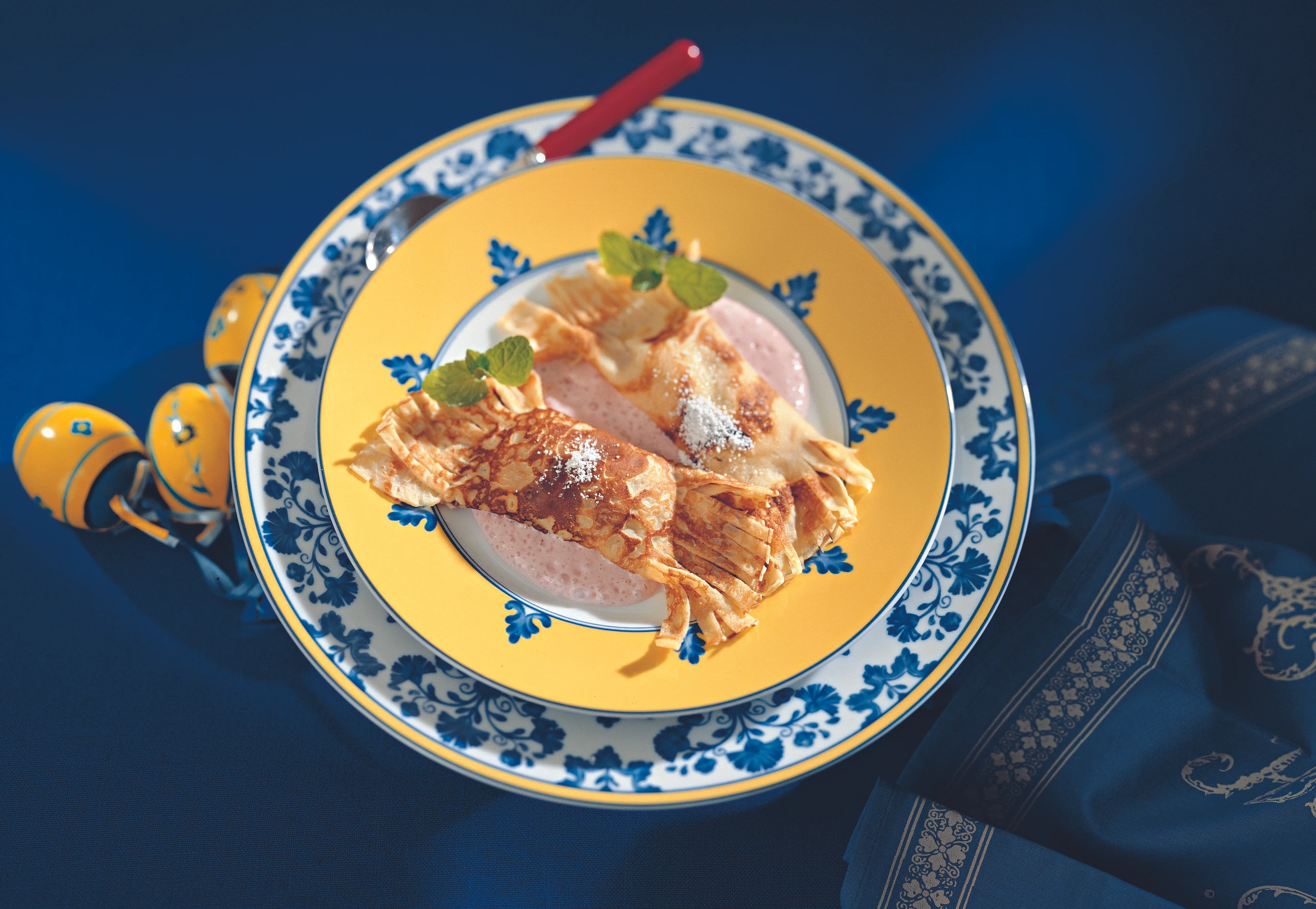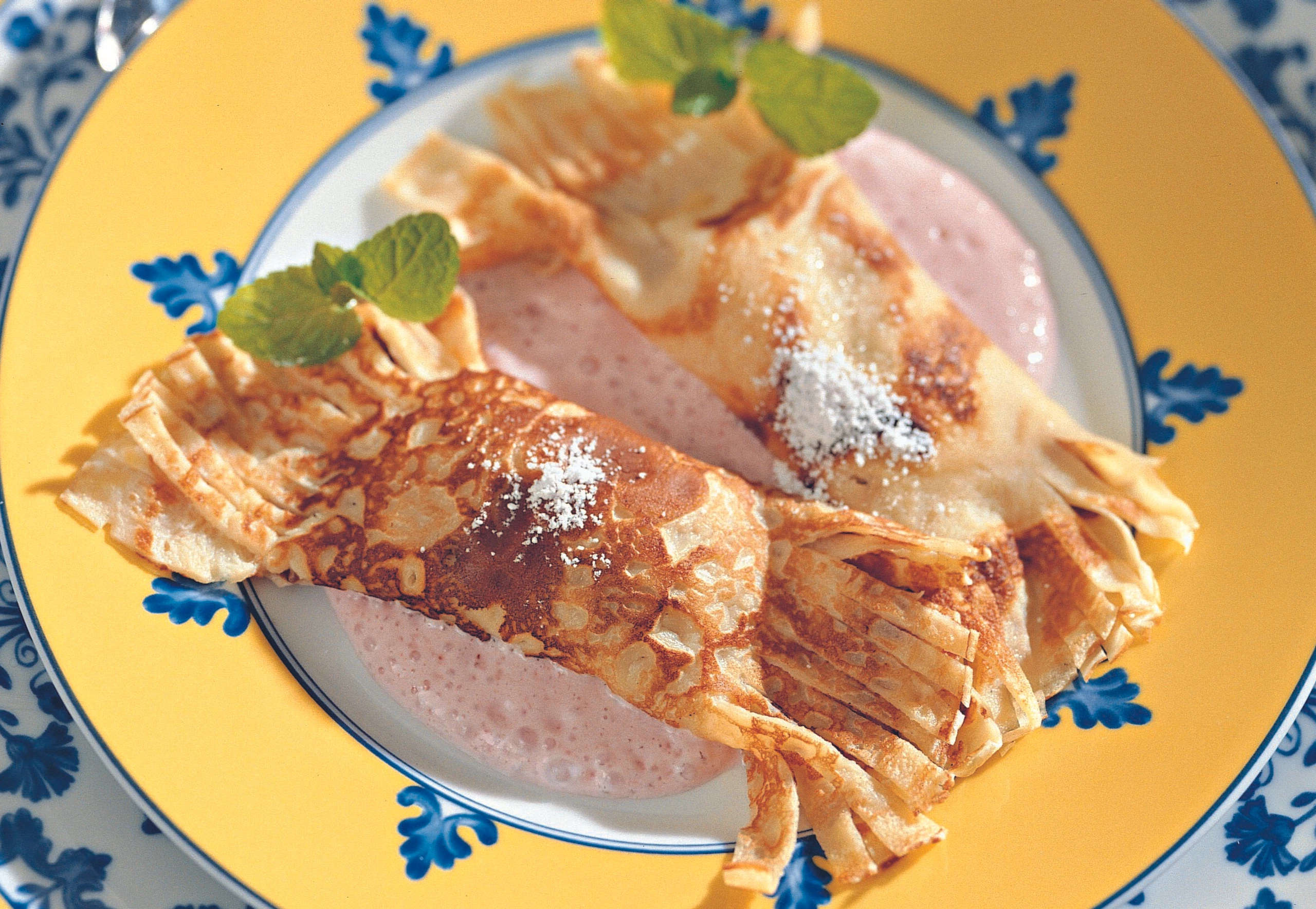 Palatschinken mit der Preiselbeersauce anrichten, mit Staubzucker bestreuen und mit Minzeblättern garniert servieren.
