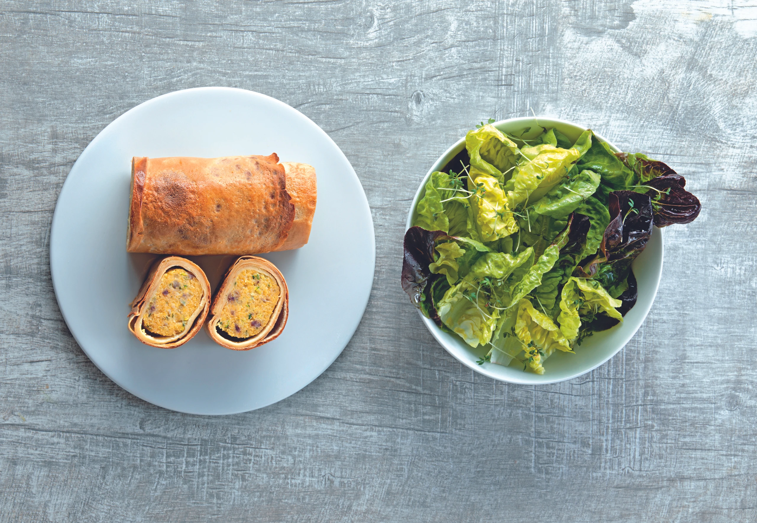 Salat zerpflücken. Für die Marinade Balsamico salzen, pfeffern und das Öl einrühren. Kresseblättchen abschneiden. Salat marinieren. Strudel portionieren und mit dem Salat anrichten. Salat mit Kresse bestreuen.