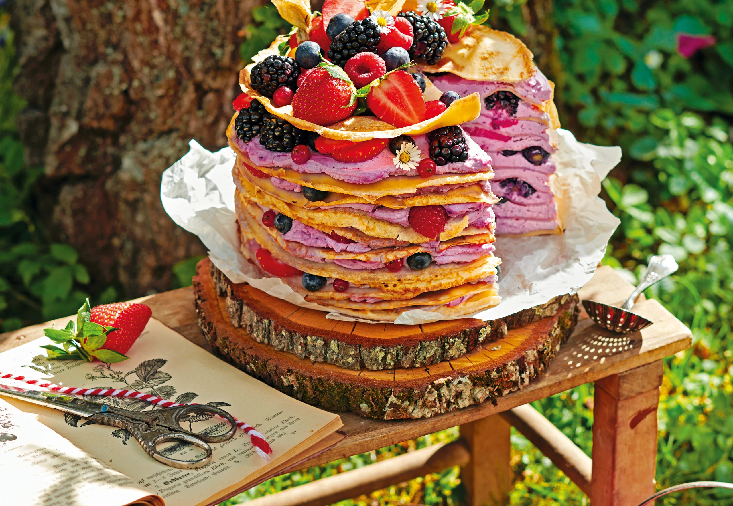 Palatschinken abwechselnd mit der Creme und den übrigen Beeren übereinanderstapeln. Torte mit gemischten Beeren belegen und für ca. 2 Stunden kühl stellen. 20 Minuten vor dem Servieren herausnehmen.