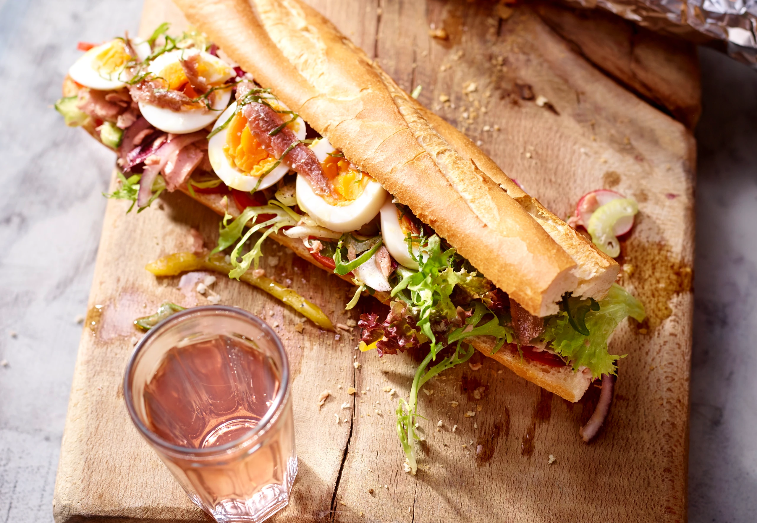 Gusto-Tipp: Pan Bagnat ist eine Sandwich-Spezialität der Region Nizza. Original wird rundes Pan-Bagnant-Brot verwendet, mittlerweile hält Baguette hier Einzug. Klassisch werden entweder Sardellen oder Thunfisch verwendet. Es soll auf keinen Fall gekochtes Gemüse hineinkommen. In der richtige Jahreszeit sind Poweraden und Favabohnen mehr als willkommen, roh selbstverständlich. Dazu muss ein Rosé aus der Provence getrunken werden!
