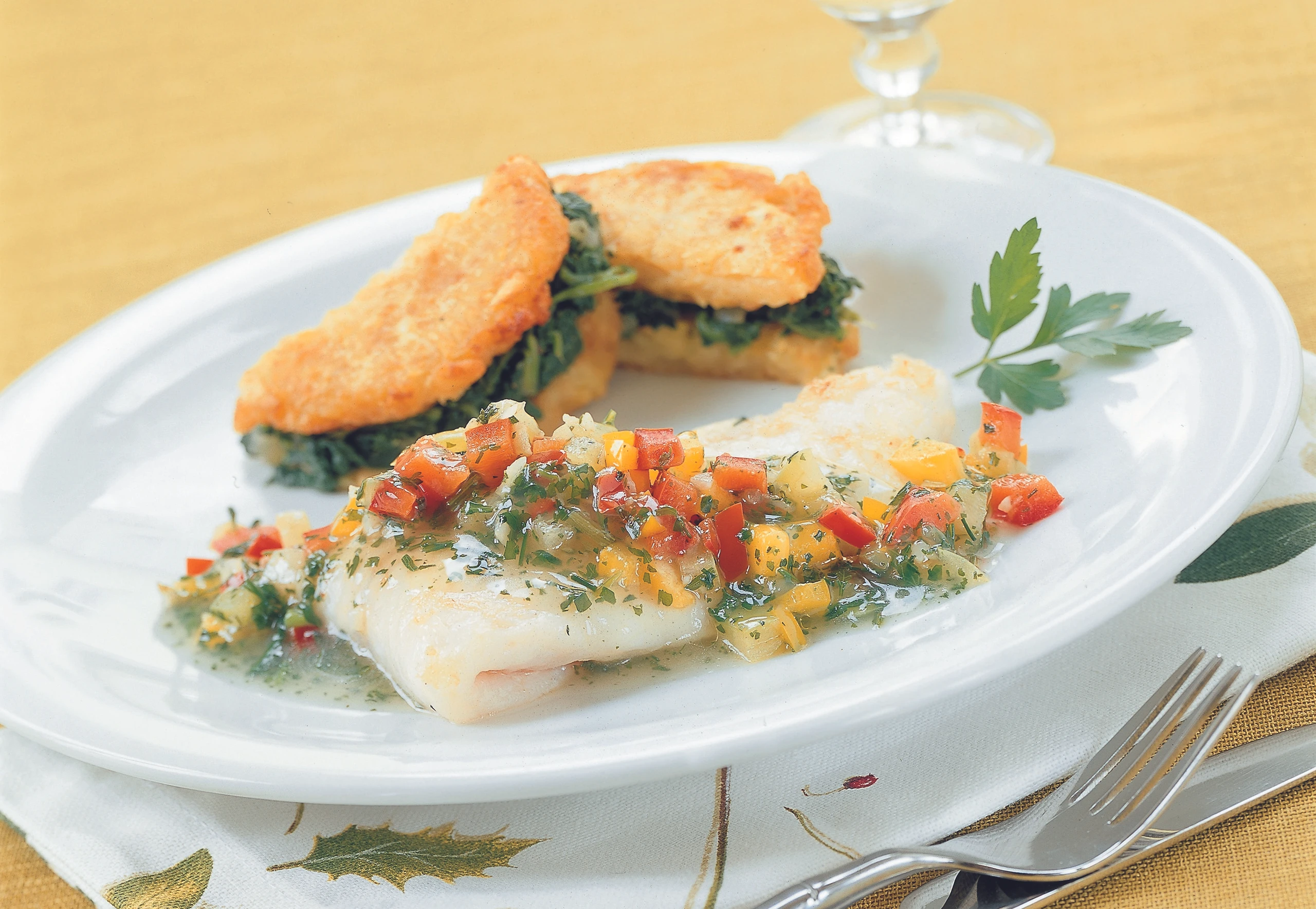 Rohr auf 80°C vorheizen. Paprika putzen und in ca. 1/2 cm große Stücke schneiden. Fischfilets salzen, pfeffern, im Öl beidseitig braten, aus der Pfanne nehmen und im Rohr warm stellen.