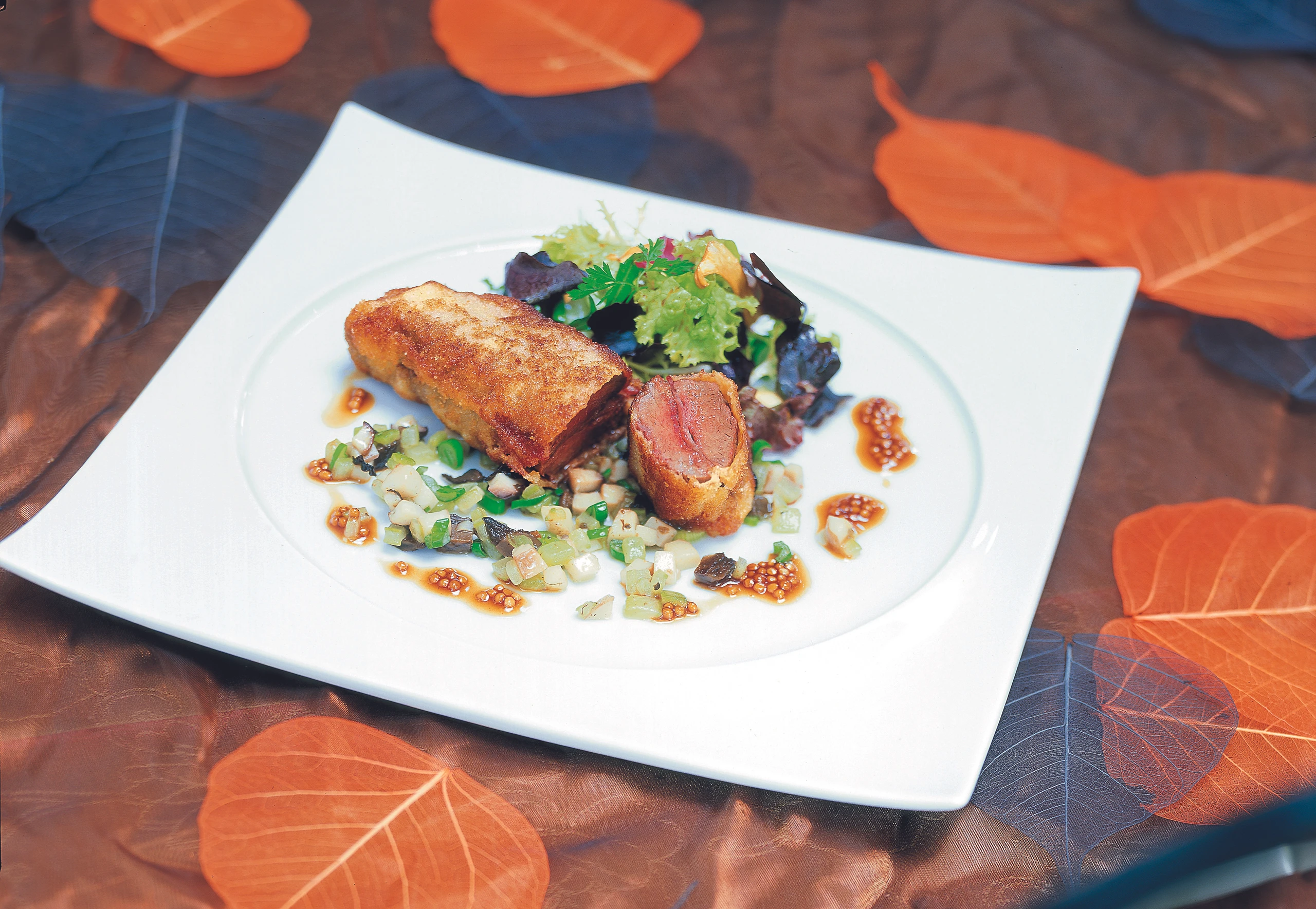 In die Hasenfilets auf einer Seite der Länge nach eine Tasche schneiden. Thymian in die Taschen streuen, je 2 Schinkenscheiben einlegen und die Öffnungen behutsam zusammendrücken. Filets salzen, pfeffern und in Mehl, Ei und Bröseln panieren.