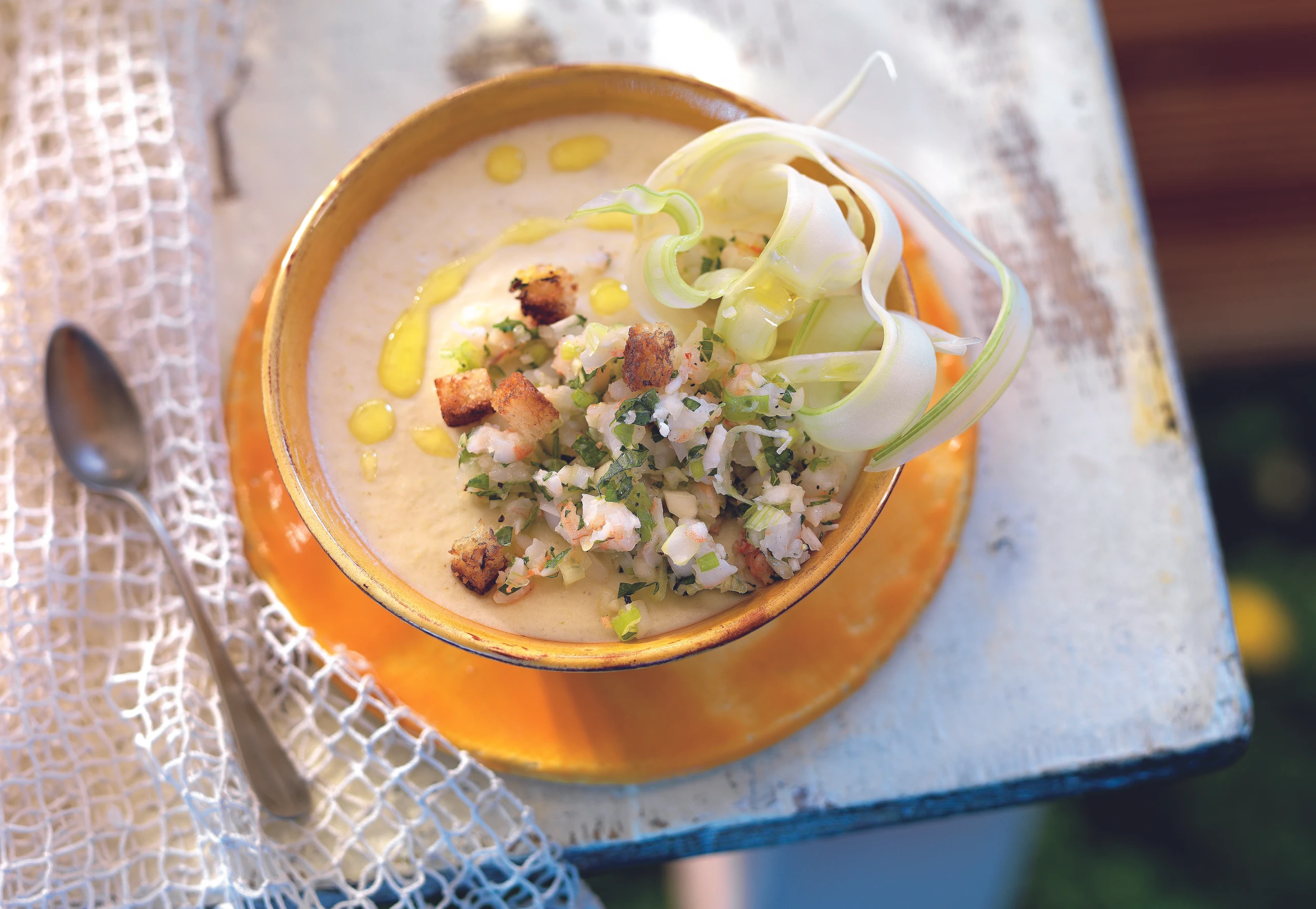 Gelatine in kaltem Wasser einweichen, ausdrücken, in die Fenchelmischung rühren und darin auflösen. Fenchelmischung fein pürieren und salzen, Crème fraîche unterrühren.