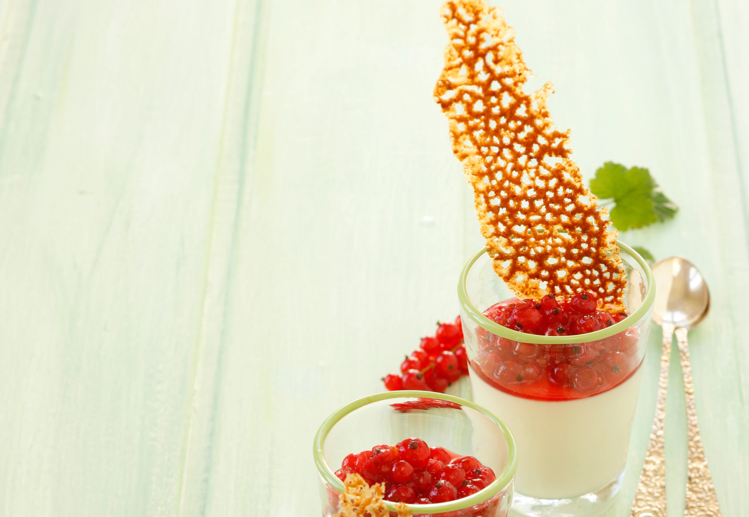 Ribiseln auf der Panna cotta verteilen, mit Hippen servieren.
