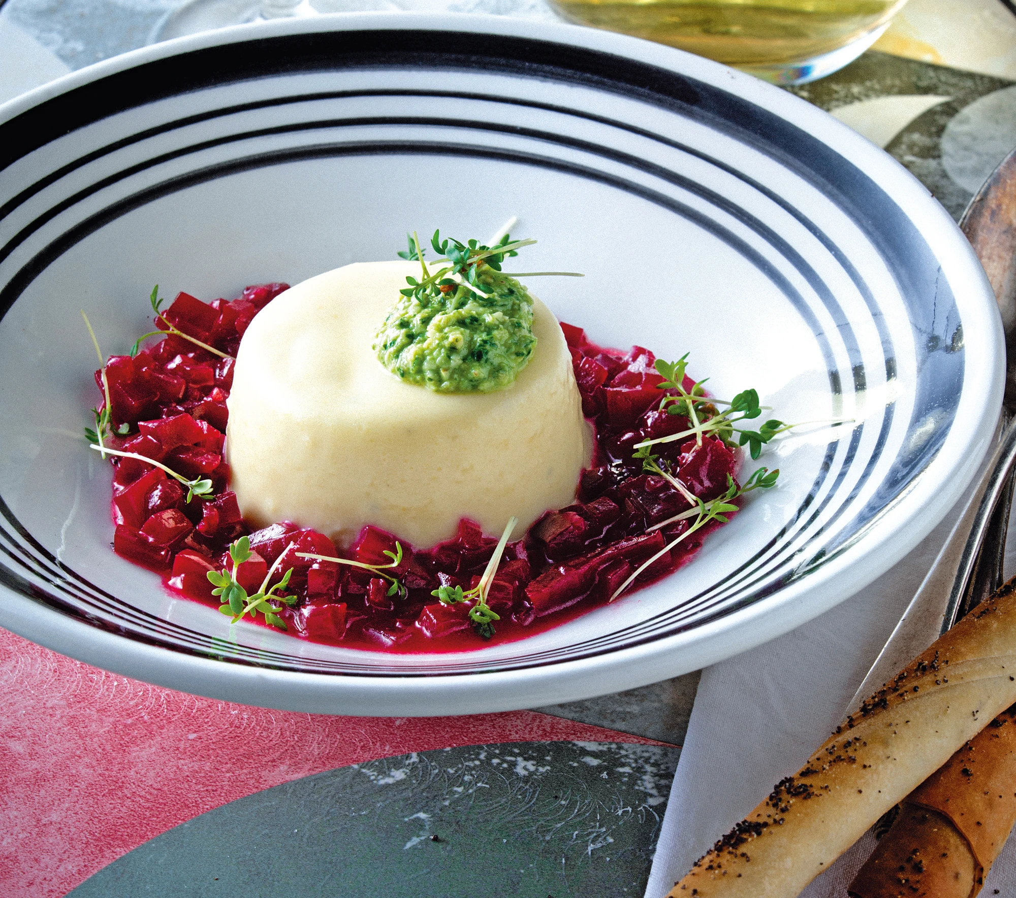Panna Cotta mit Roten Rüben, Petersilie-Nusspesto und Mohnröllchen