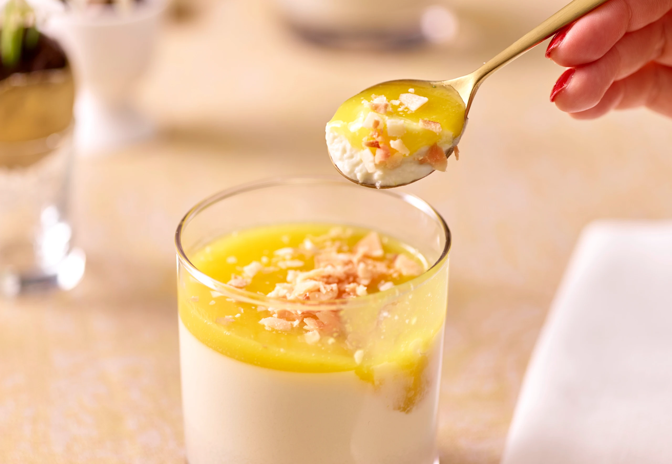 - Ananassauce auf der Panna cotta verteilen und mit Kokoschips bestreut servieren.
