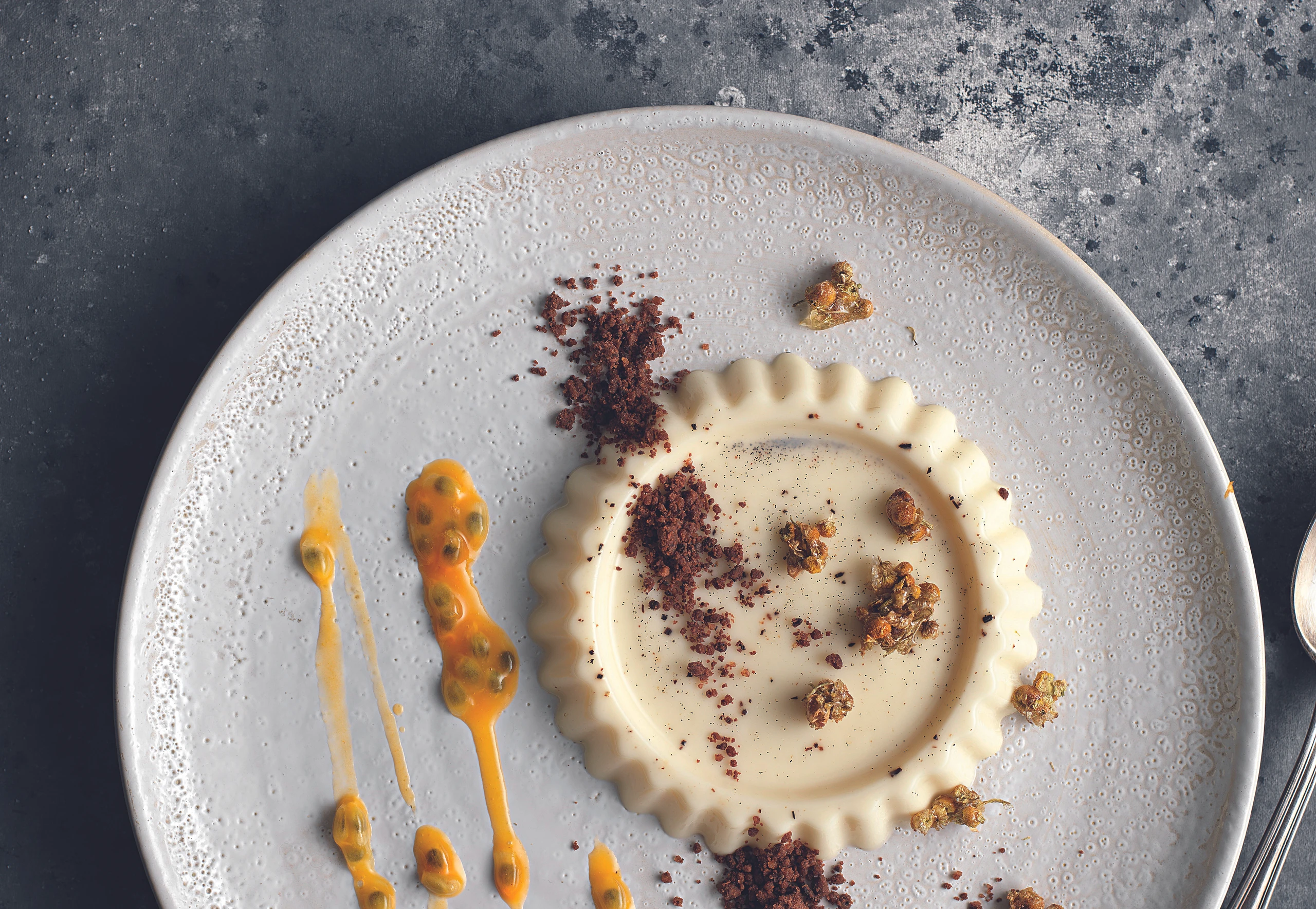 - Förmchen kurz in heißes Waser tauchen, Panna Cotta auf einen Teller stürzen, mit Passionsfruchtmark, Schoko-Erde und karamellisierter Kamille garnieren.