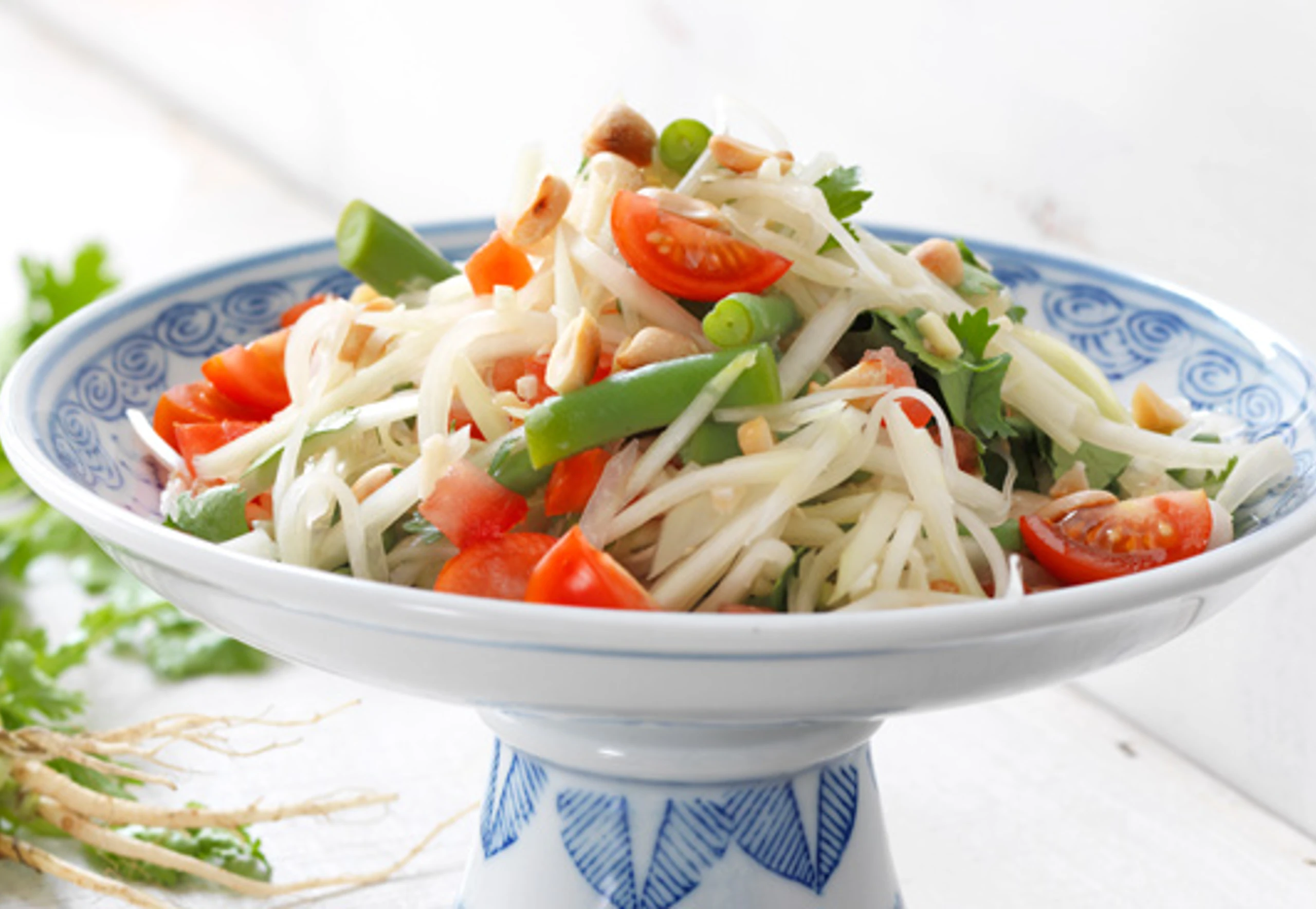 - Paste, Bohnen und die Hälfte der Paradeisviertel mit der Papaya vermischen und mit dem Stößel des Mörsers etwas stampfen, damit sich die Aromen verbinden. Salat mit übrigen Paradeisern und Nüssen garnieren und mit Korianderblättchen bestreut servieren.
