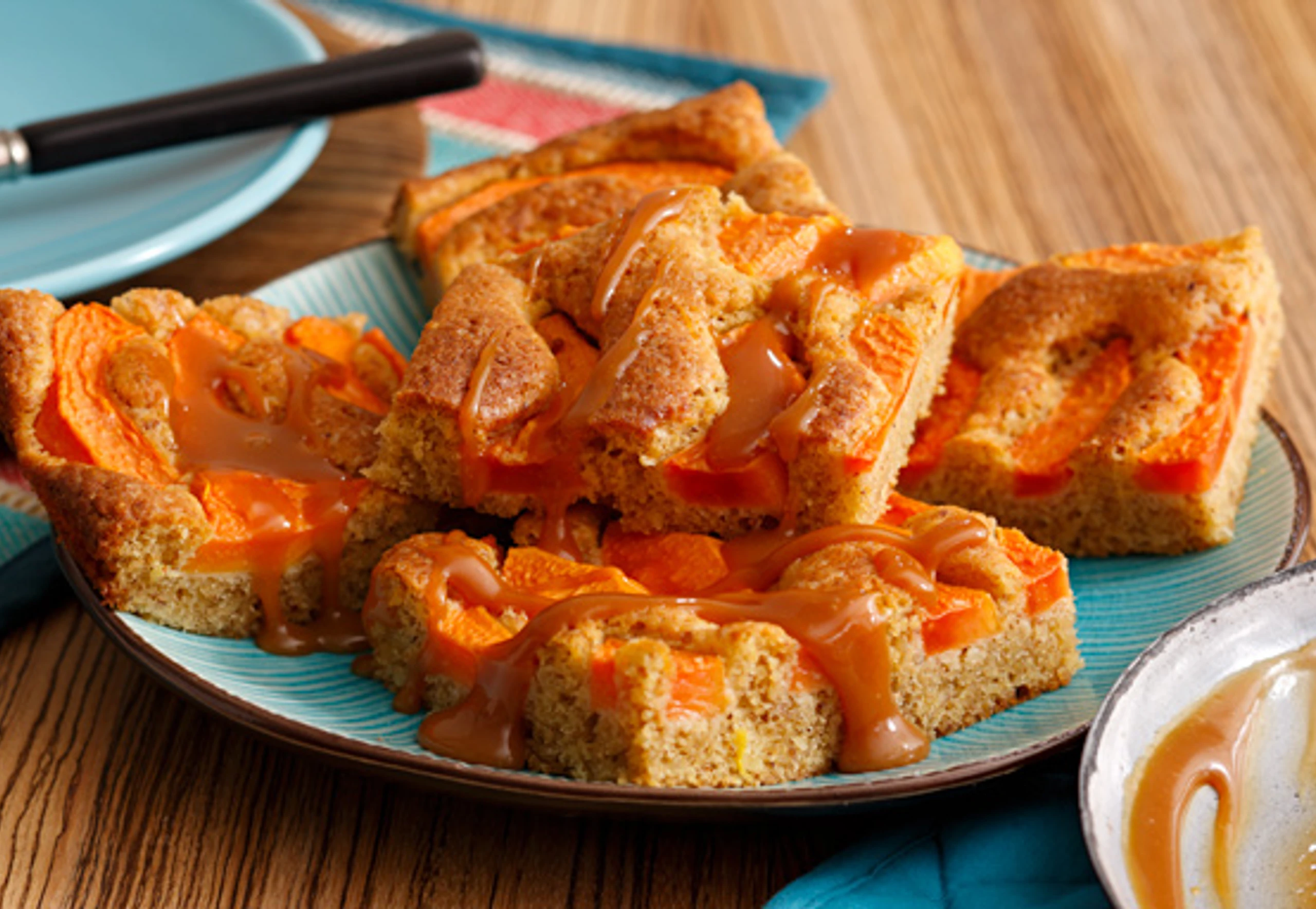 Kuchen herausnehmen und auskühlen lassen. Portionieren und vor dem Servieren mit Karamellsauce garnieren.