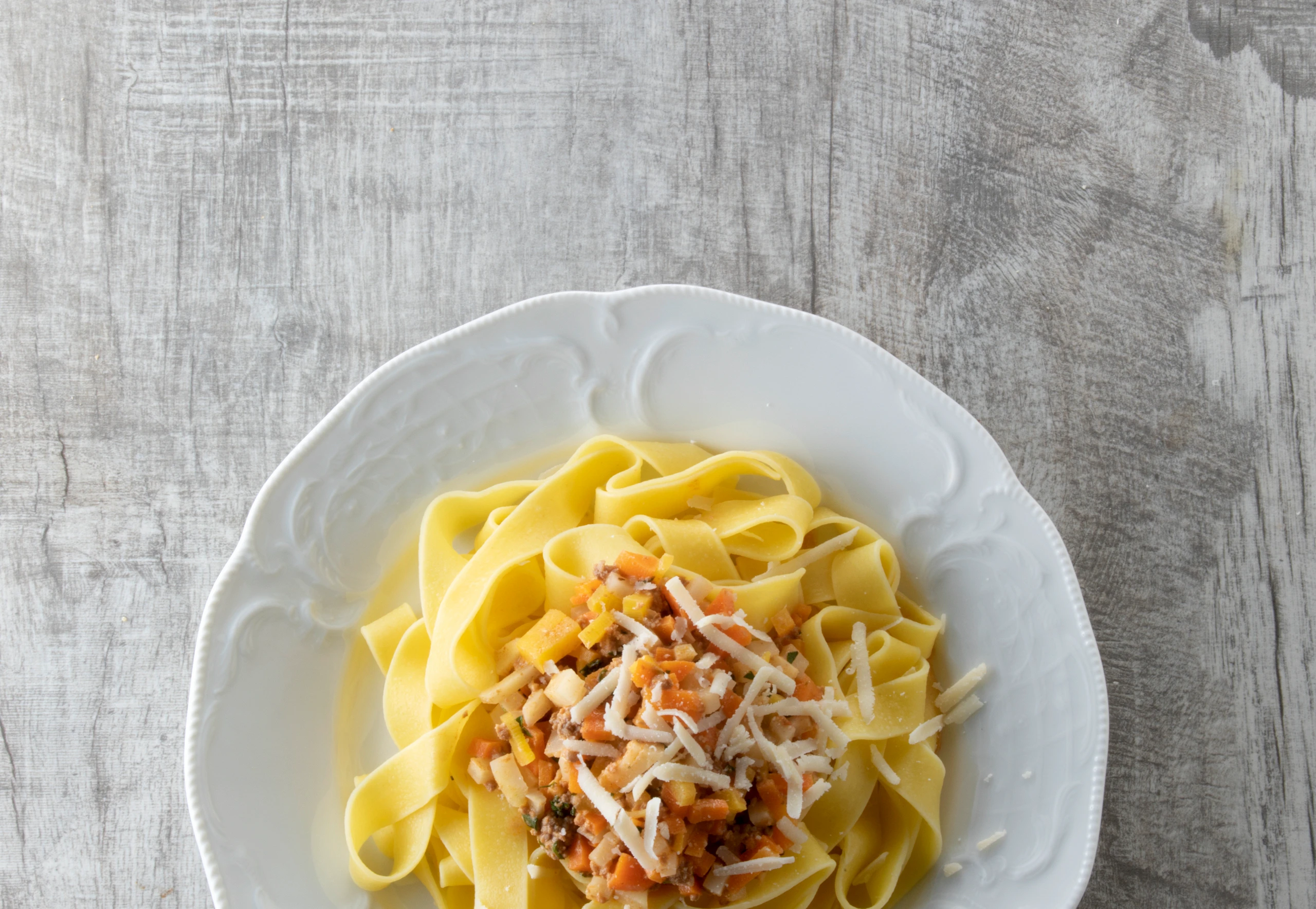 Karotten und Gelbe Rüben schälen, klein würfelig schneiden und im Öl anschwitzen. Sauce Bolognese unterrühren, salzen und pfeffern. Suppe zugießen, Crème fraîche einrühren und die Sauce ca. 15 Minuten köcheln.