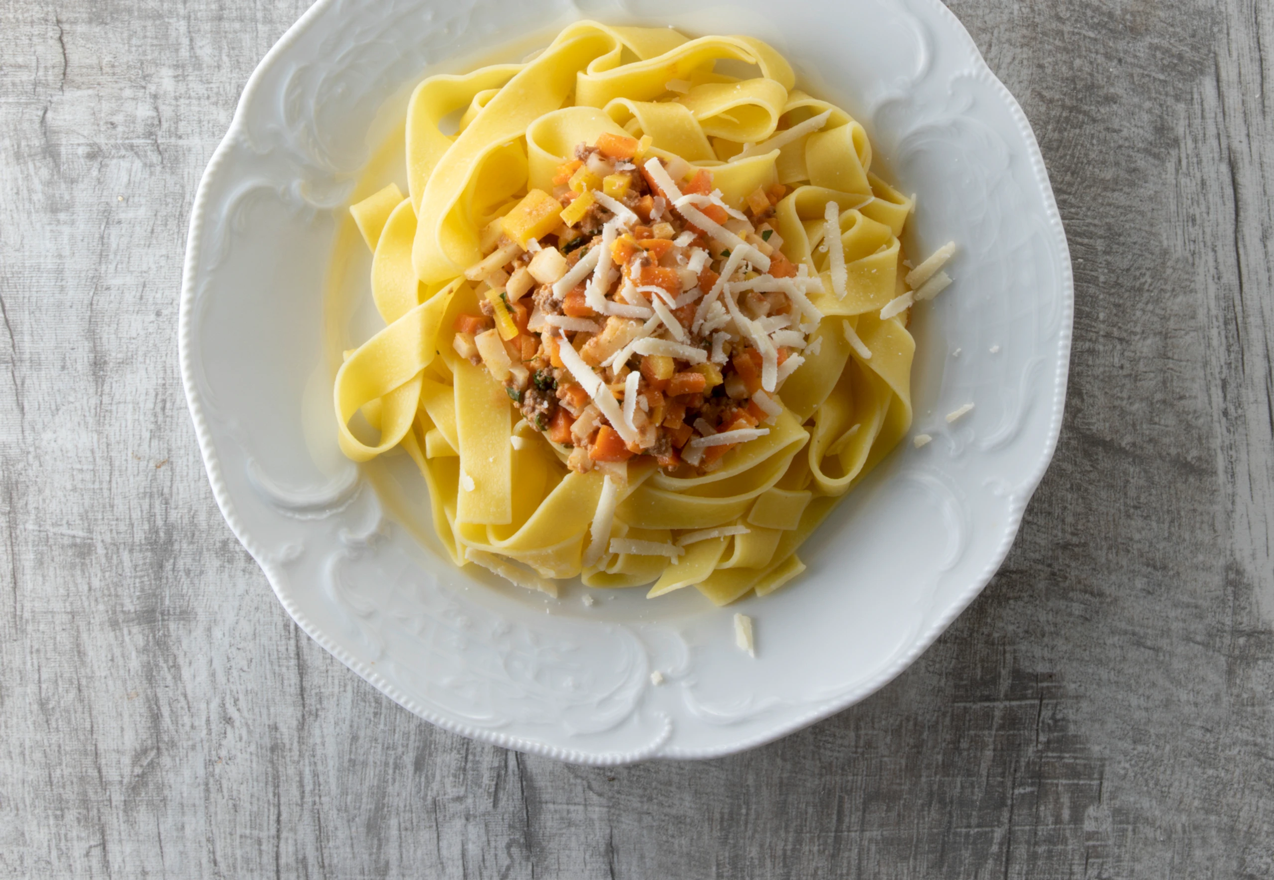 Majoran in die Sauce rühren, Sauce pürieren. Pappardelle mit der Sauce vermischen und mit Parmesan bestreut servieren.