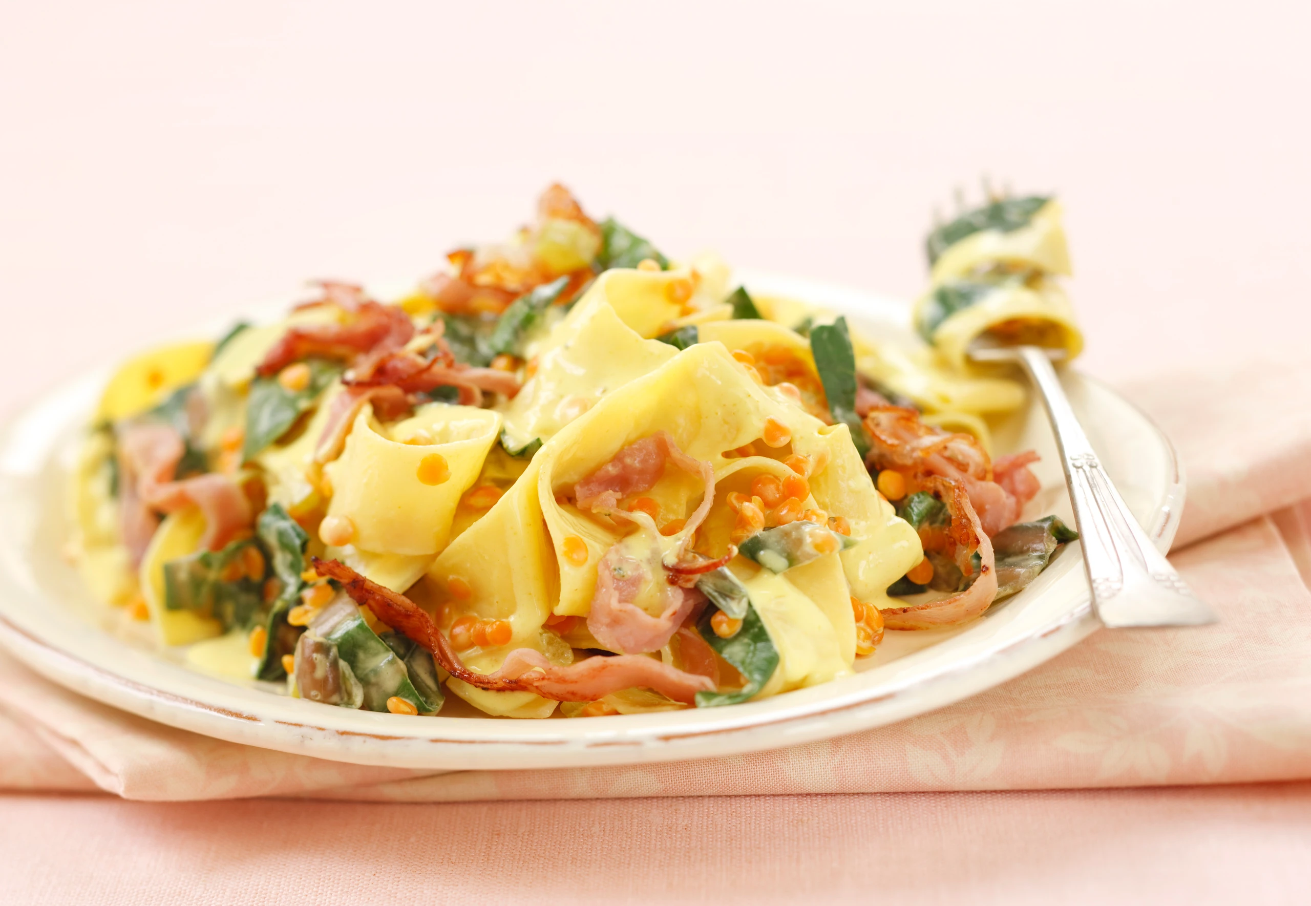 - Pappardelle in Salzwasser bissfest kochen, am Ende der Garzeit Mangold zugeben und kurz mitkochen. Mischung abseihen und abtropfen lassen. Pappardelle und Mangold mit Sauce und Schinken ver-mischen, salzen und pfeffern.